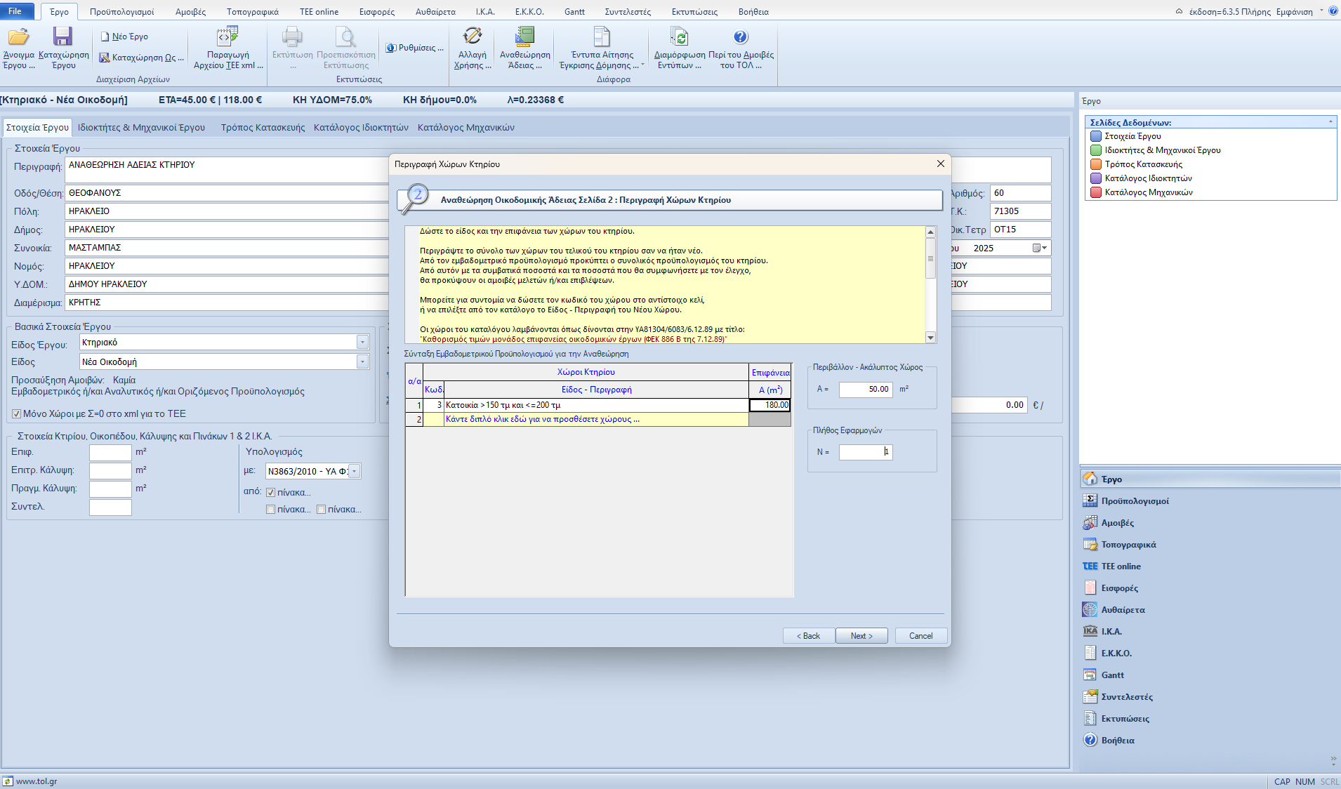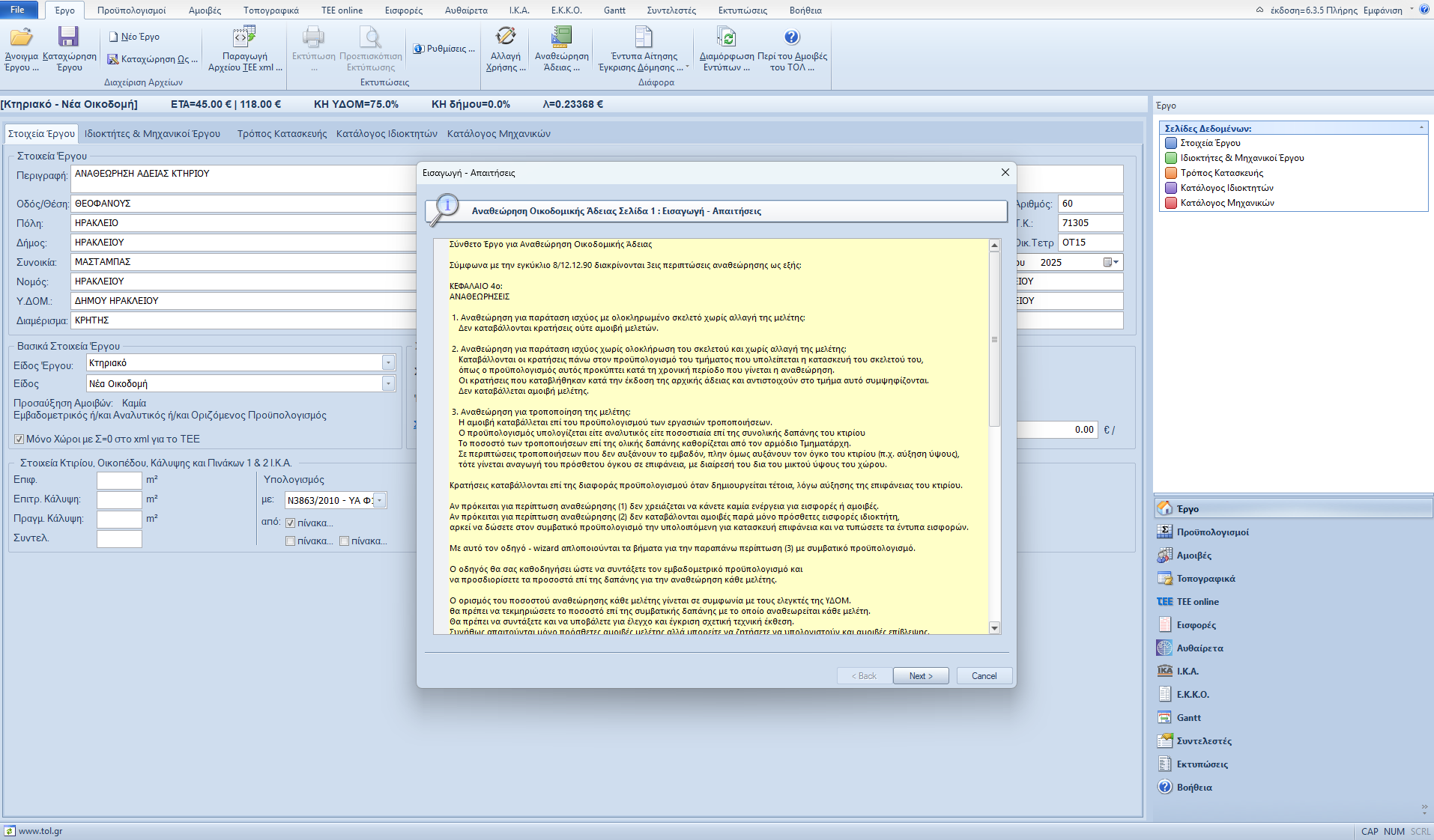Η αναθεώρηση οικοδομικής άδειας πραγματοποιείται σύμφωνα με την εγκύκλιο 8/12.12.90 και είναι σχετικά απλό ως έργο και με η χρήση του wizard γίνεται ακόμα απλούστερο αφού όλα τα βήματα συγκεντρώνονται σε 2 σελίδες δεδομένων.