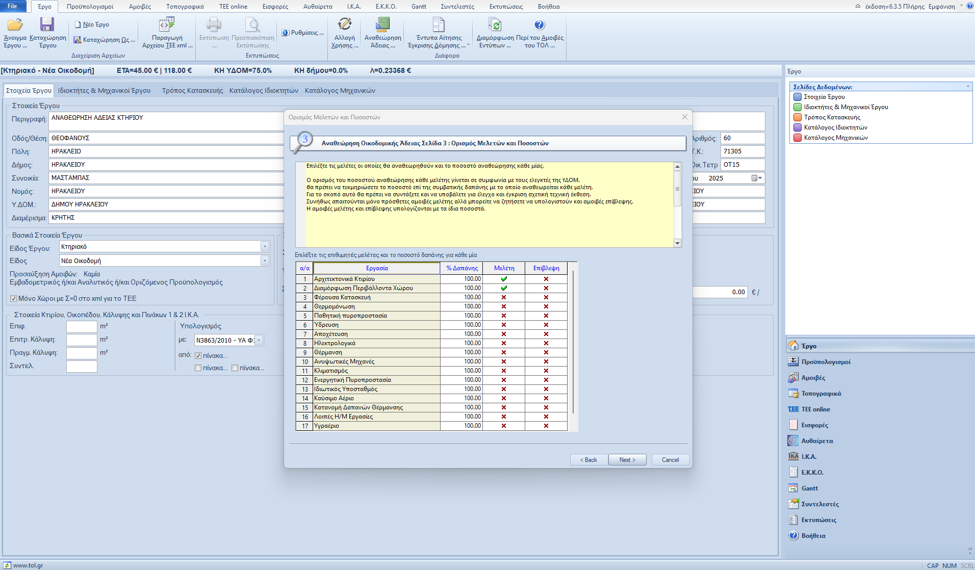 Στην σελίδα αυτή επιλέγουμε τις μελέτες ή/και τις επιβλέψεις οι οποίες αναθεωρούνται και επιπλέον το εκτιμώμενο από εμάς ή το συμφωνημένο με τον ελεγκτή, ποσοστό αναθεώρησης κάθε μιας χωριστά.