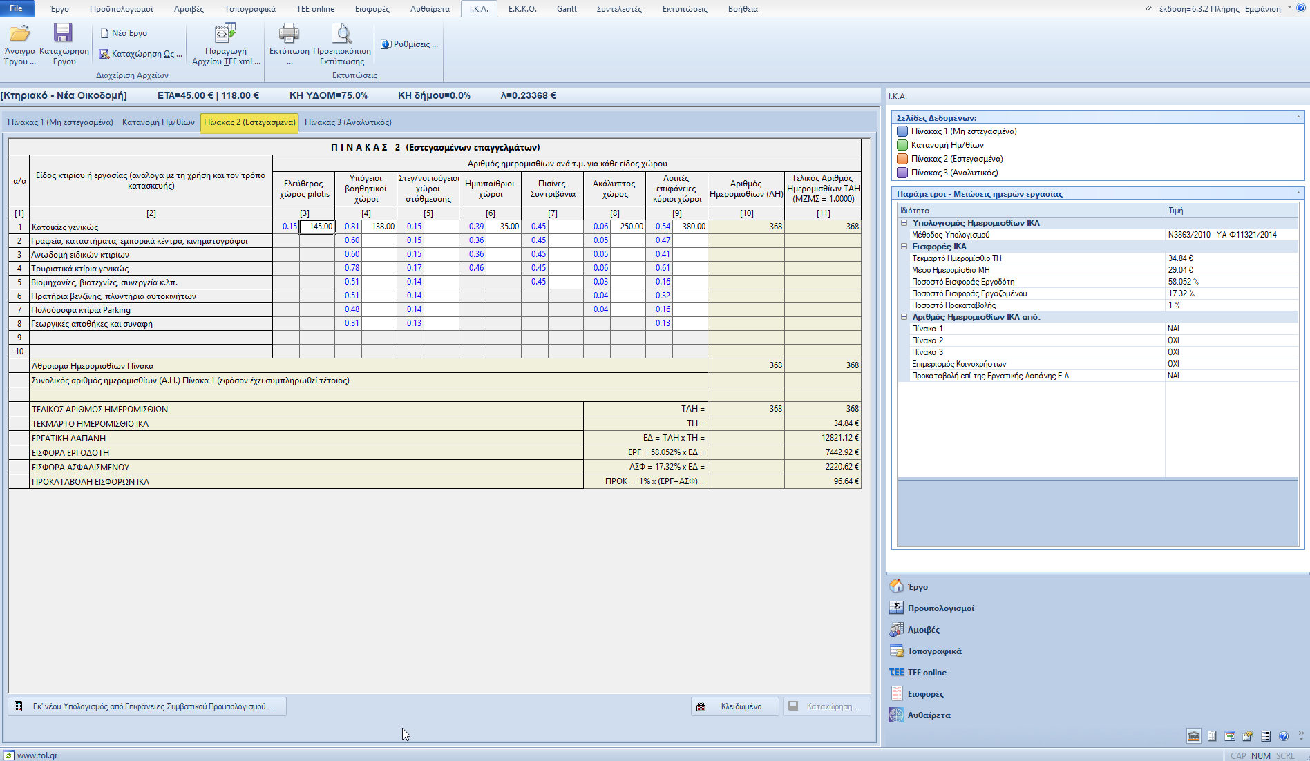 Αν πρόκειται για μεταλλικό κτίριο ή κτίριο που κατασκευάζεται από συνεργεία στεγασμένων επαγγελμάτων το πρόγραμμα συμπληρώνει τον πίνακα 2 του ΙΚΑ. Το πλήθος των ημερομισθίων που προκύπτουν από τον πίνακα 2 είναι σημαντικά μειωμένο σε σχέση με τον πίνακα 1, άρα προκύπτει σημαντικό όφελος για τον κύριο του έργου. Εφόσον τα ημερομίσθια υπολογίζονται ταυτόχρονα με τον πίνακα 1 και με τον πίνακα 2, στον πίνακα 2 μεταφέρεται το σύνολο των ημερομισθίων του πίνακα 1 ώστε ο τελικός αριθμός ημερομισθίων του πίνακα 2 να είναι ο συνολικός.