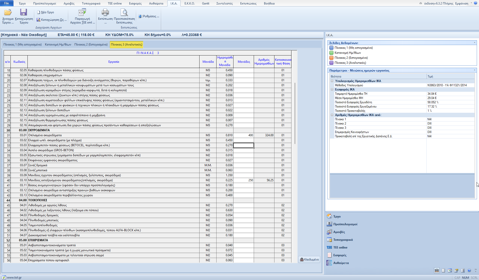 Ο πίνακας 3 ΙΚΑ συμπληρώνεται αυτόματα με τις ποσότητες όσων εργασιών του πίνακα αναλυτικών εργασιών ΑΤΟΕ έχουν αντιστοίχιση με κάποια εργασία του πίνακα 3 του ΙΚΑ. Μπορούμε φυσικά να συμπληρώσουμε και απευθείας τις ποσότητες στον πίνακα 3.