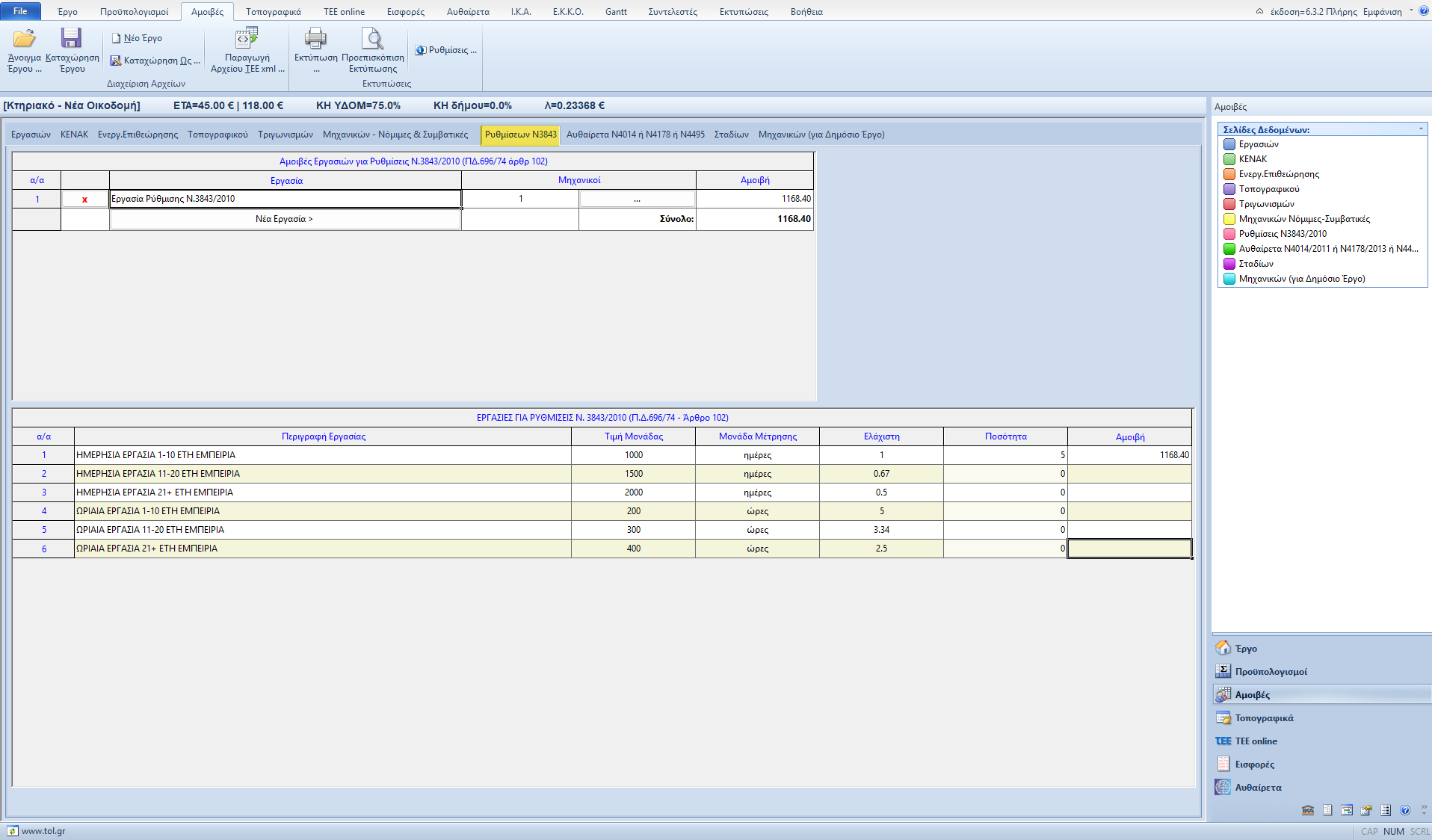 Στην σελίδα «Ρυθμίσεων Ν3843» μπορεί ο χρήστης να ορίσει τις αμοιβές εργασιών του μηχανικού για ρυθμίσεις Ν. 3843/2010 (Π.Δ. 696/74 άρθρο 102).