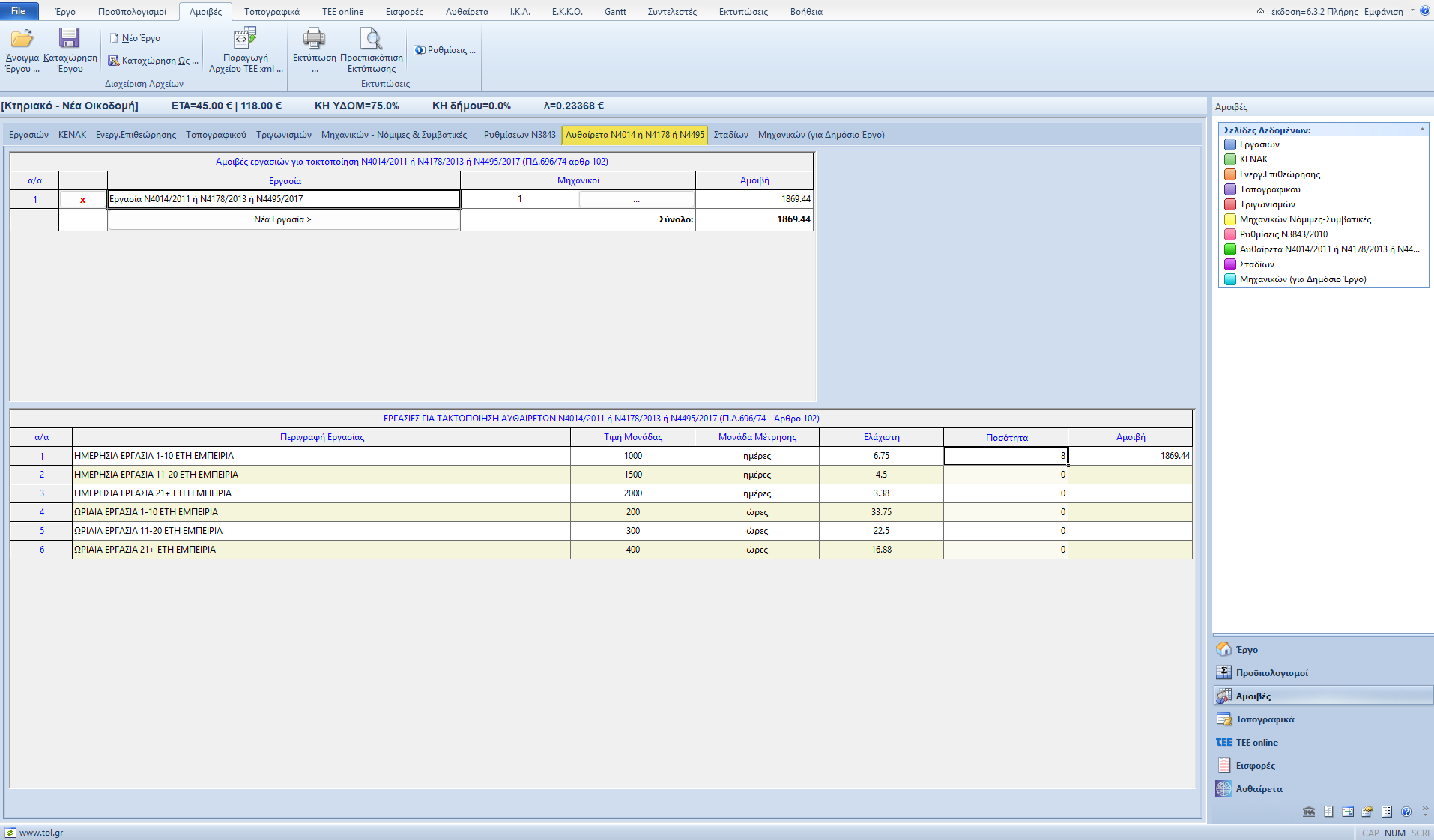 Στην σελίδα «Αυθαίρετα Ν4014 ή Ν4178» μπορεί ο χρήστης να ορίσει τις αμοιβές εργασιών του μηχανικού για Τακτοποίηση Ν.4014/2011 ή Ν.4178/2013 (Π.Δ.696/1974 άρθρο 102).