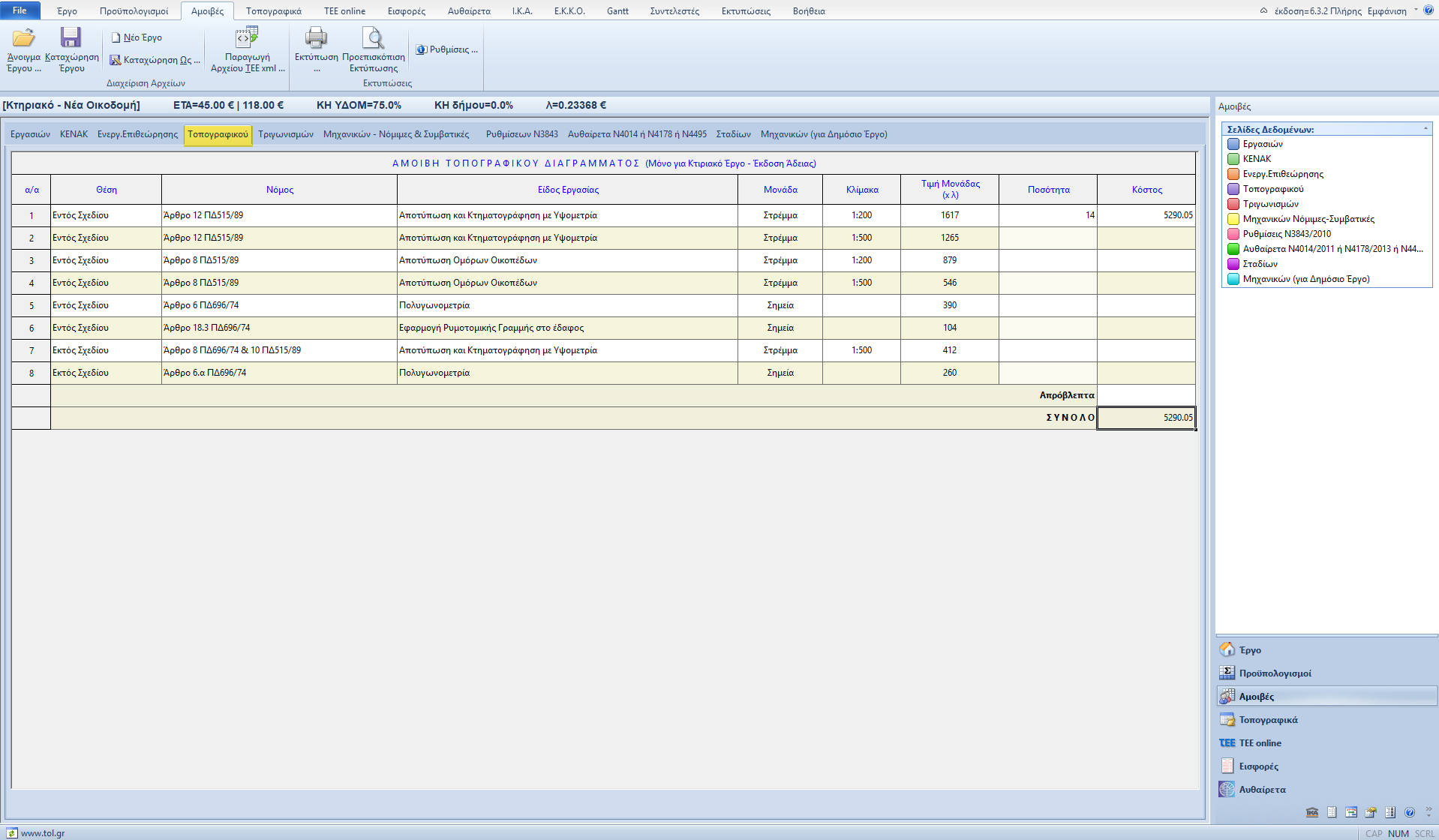 Υπολογίζονται οι Αμοιβές Τοπογραφικών Εργασιών για την έκδοση οικοδομικών αδειών κτιριακών έργων.
