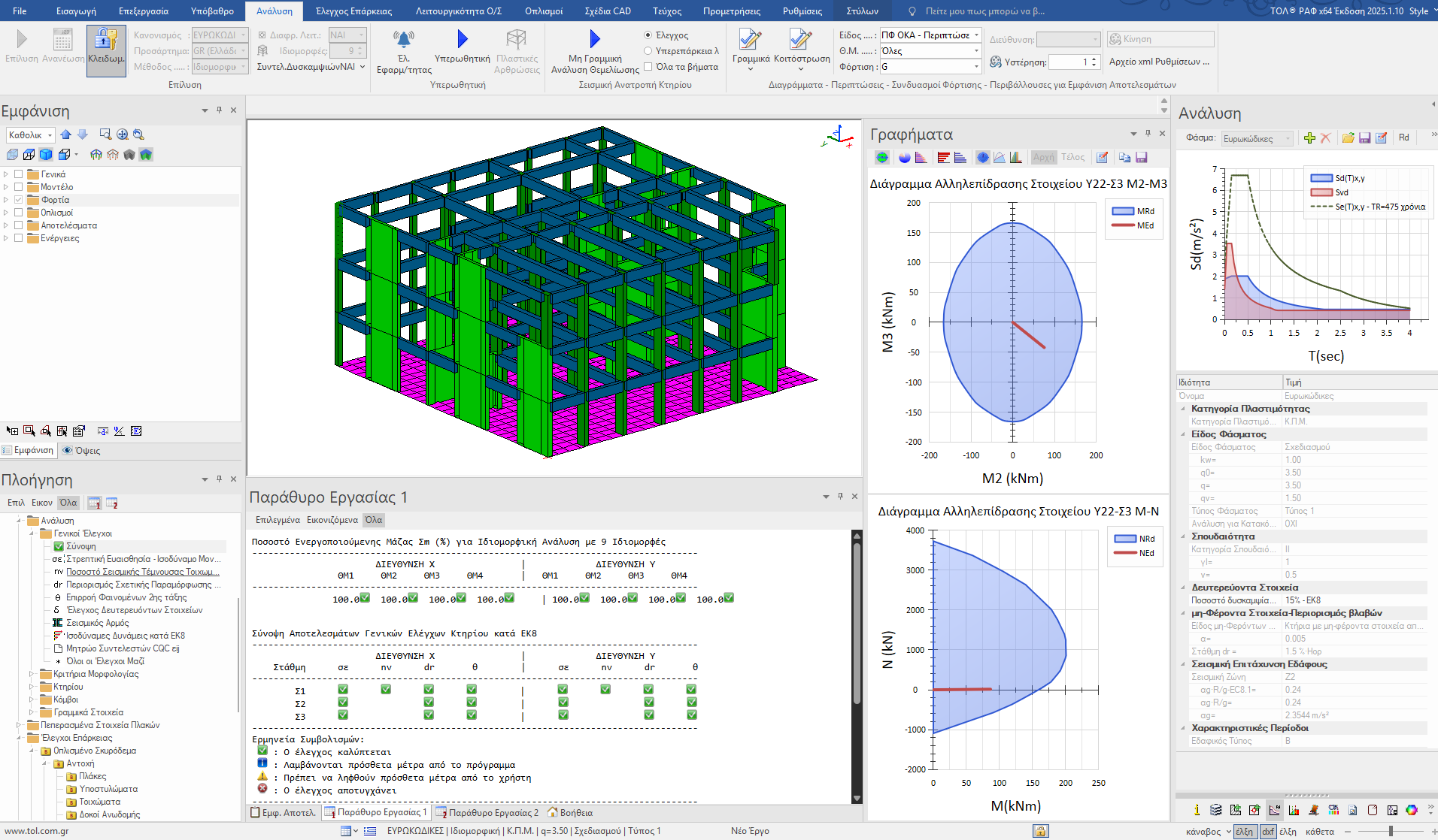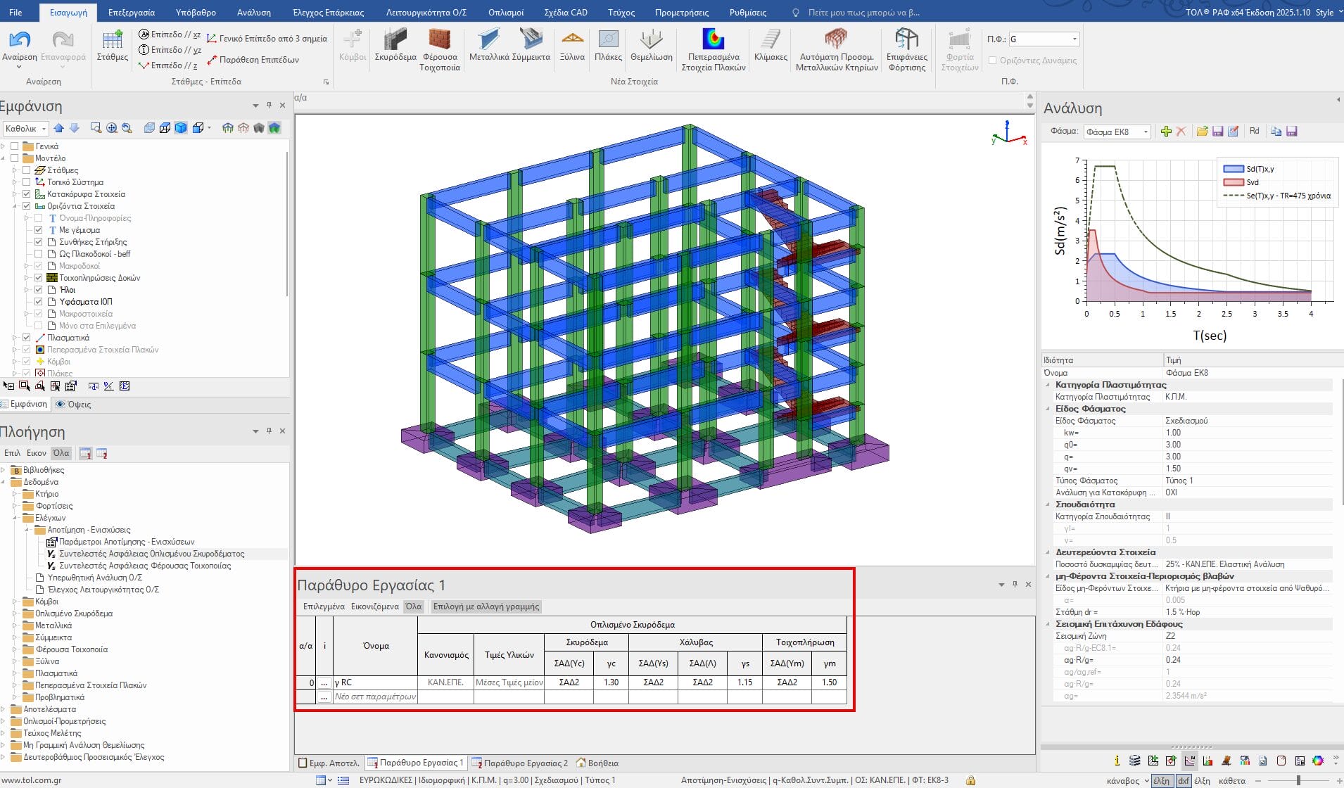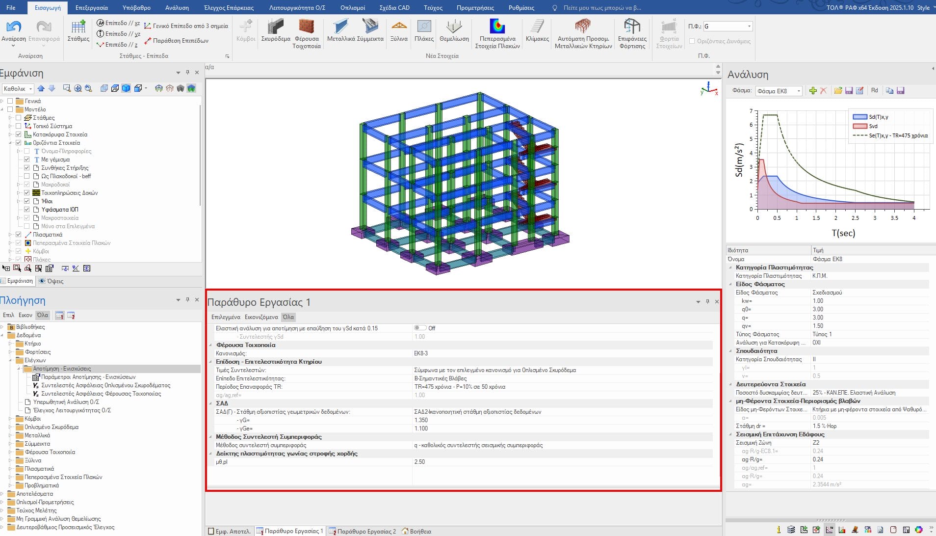 Η ελαστική δυναμική φασματική ανάλυση πραγματοποιείται στο ΡΑΦ για την αποτίμηση υφισταμένων κτηρίων σύμφωνα με τις προδιαγραφές του ΚΑΝ.ΕΠΕ. χωρίς κανένα περιορισμό στην εφαρμογή της. Κατά την ελαστική ανάλυση, εισάγεται με εύκολο τρόπο στο περιβάλλον του προγράμματος, η γεωμετρία, οι ποιότητες των υλικών κι ο οπλισμός των διατομών των δομικών μελών του φορέα. H ανάλυση γίνεται με δύο τρόπους: είτε με τη μέθοδο του καθολικού συντελεστή συμπεριφοράς q για το σύνολο του κτηρίου, είτε με τη μέθοδο των τοπικών δεικτών m για τα επιμέρους δομικά στοιχεία.