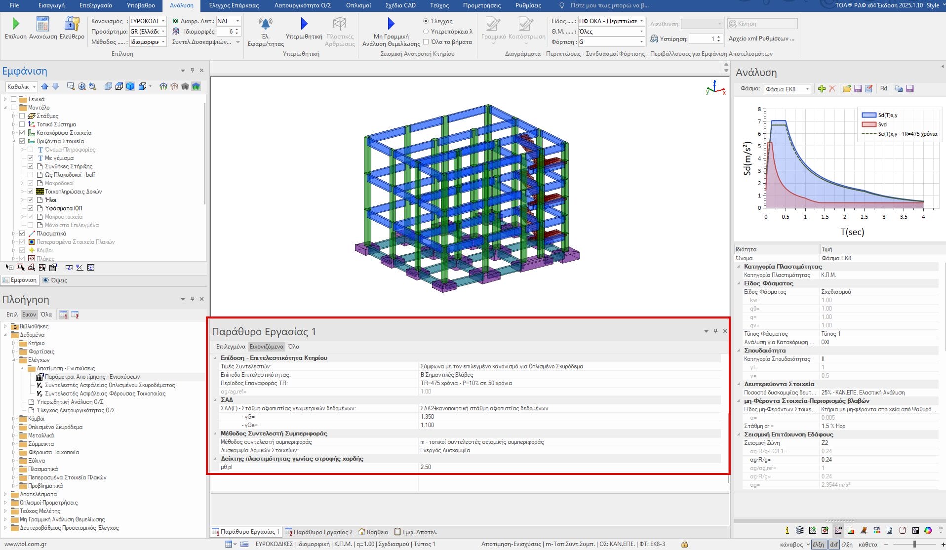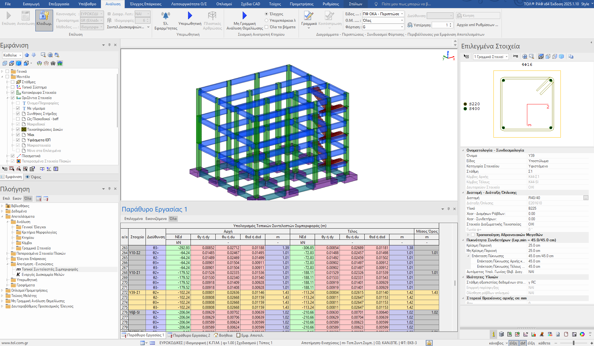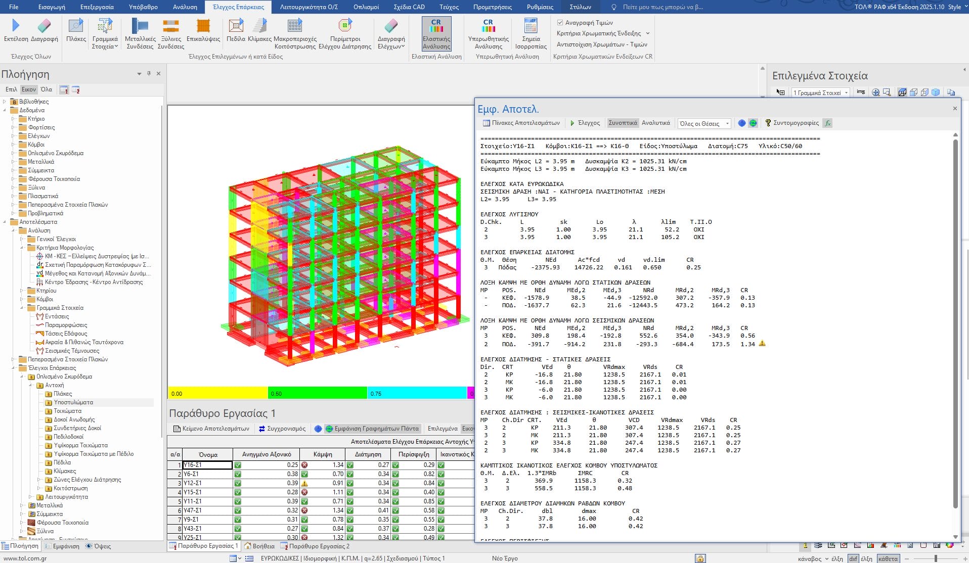 Αφού ολοκληρωθεί η ανάλυση, πραγματοποιούνται όλοι οι έλεγχοι επάρκειας των αντοχών των δομικών μελών σύμφωνα με τις προβλέψεις του κανονισμού και προσφέρονται στο μηχανικό τα αποτελέσματα σε μορφή πινάκων, διαγραμμάτων, συνοπτικών και αναλυτικών κειμένων και χρωματικής ένδειξης.