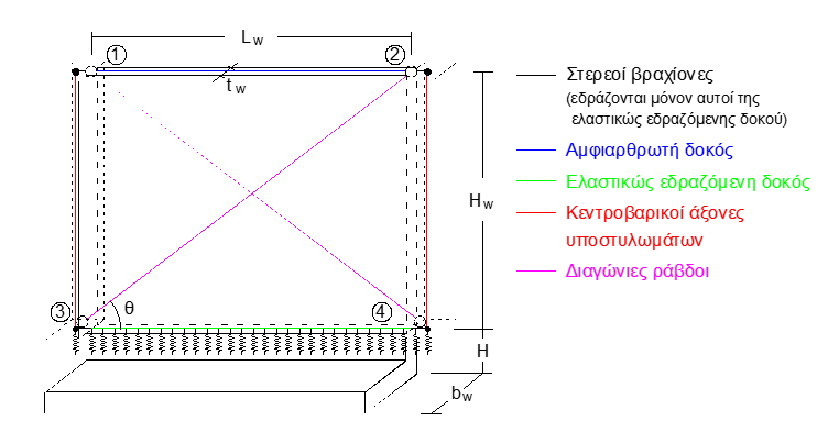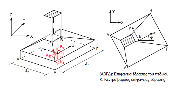 Τα πέδιλα θεμελίωσης μπορεί να είναι είτε μεμονωμένα είτε κοινά και να φέρουν περισσότερα από ένα υποστυλώματα. Τα μεμονωμένα πέδιλα προσομοιώνονται μέσω τριών ελατηρίων, ενός μεταφορικού κατά την διεύθυνση του κατακόρυφου άξονα και δύο στροφικών, τοποθετημένα στο κέντρο έδρασης του πεδίλου. Η προσομοίωση του σώματος του πεδίλου γίνεται με τη βοήθεια απολύτως στερεών βραχιόνων, οι οποίοι συνδέουν το κέντρο βάρους της επιφάνειας έδρασης με τους κόμβους όλων των ραβδωτών στοιχείων που συνδέονται με το πέδιλο (π.χ. συνδετήριες δοκούς).