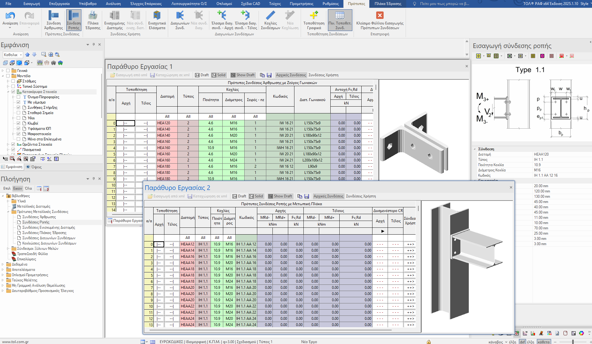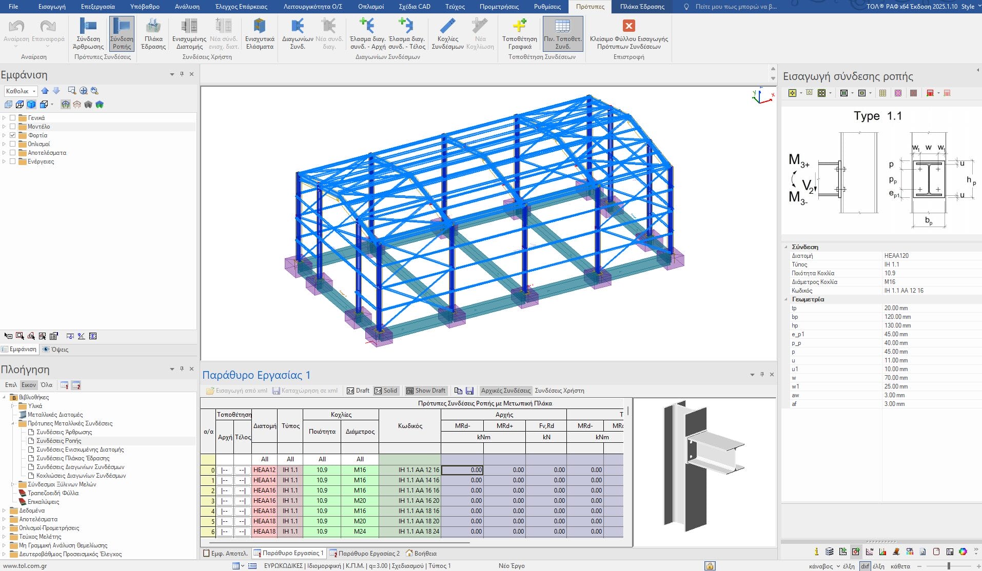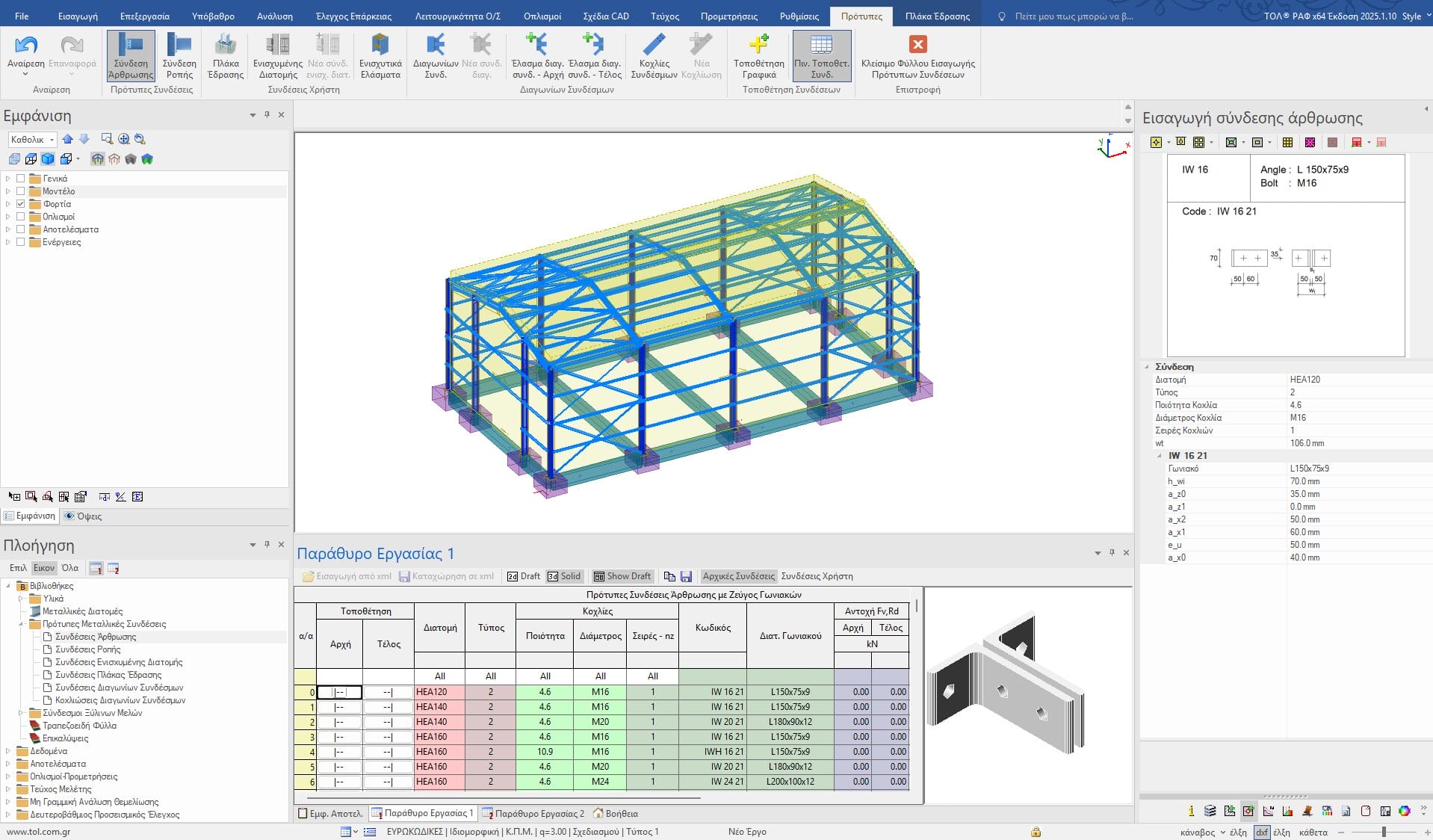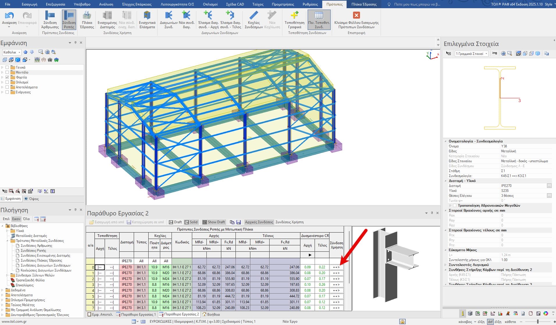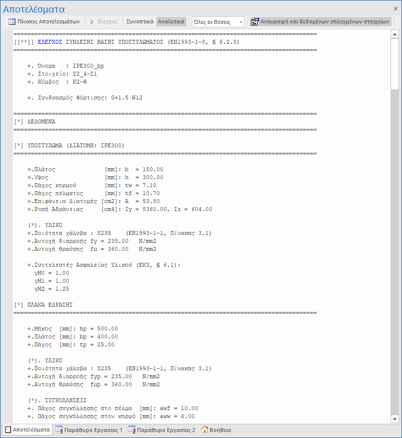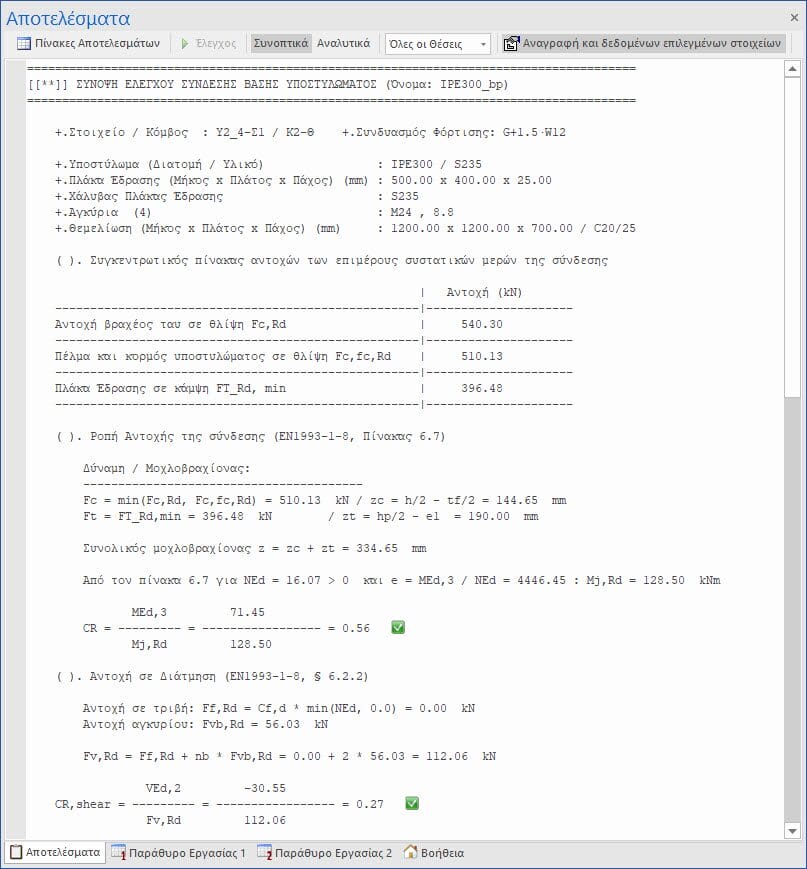 Ο έλεγχος επάρκειας των συνδέσεων πραγματοποιείται αυτόματα κατά την εισαγωγή τους στο προσομοίωμα του φορέα, εφόσον έχει προηγηθεί η επίλυσή του. Τα αποτελέσματα εκτός από τη χρωματική απεικόνιση του δυσμενέστερου λόγου εξάντλησης στην οθόνη, παρουσιάζονται συνοπτικά σε πίνακες αλλά και σε μορφή κειμένου. Επίσης, υπάρχει η πολύ αναλυτική παρουσίαση σε κείμενο αποτελεσμάτων, όλων των ελέγχων που πραγματοποιούνται για κάθε τύπο σύνδεσης με αναφορές στις παραγράφους του ΕΚ3-1.8. Με αυτόν τον τρόπο ο μηχανικός μπορεί να επιβεβαιώσει και να εξακριβώσει πλήρως τα εξαγόμενα αποτελέσματα.