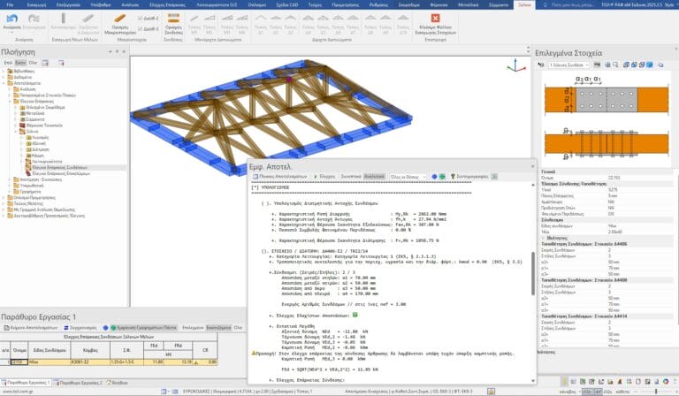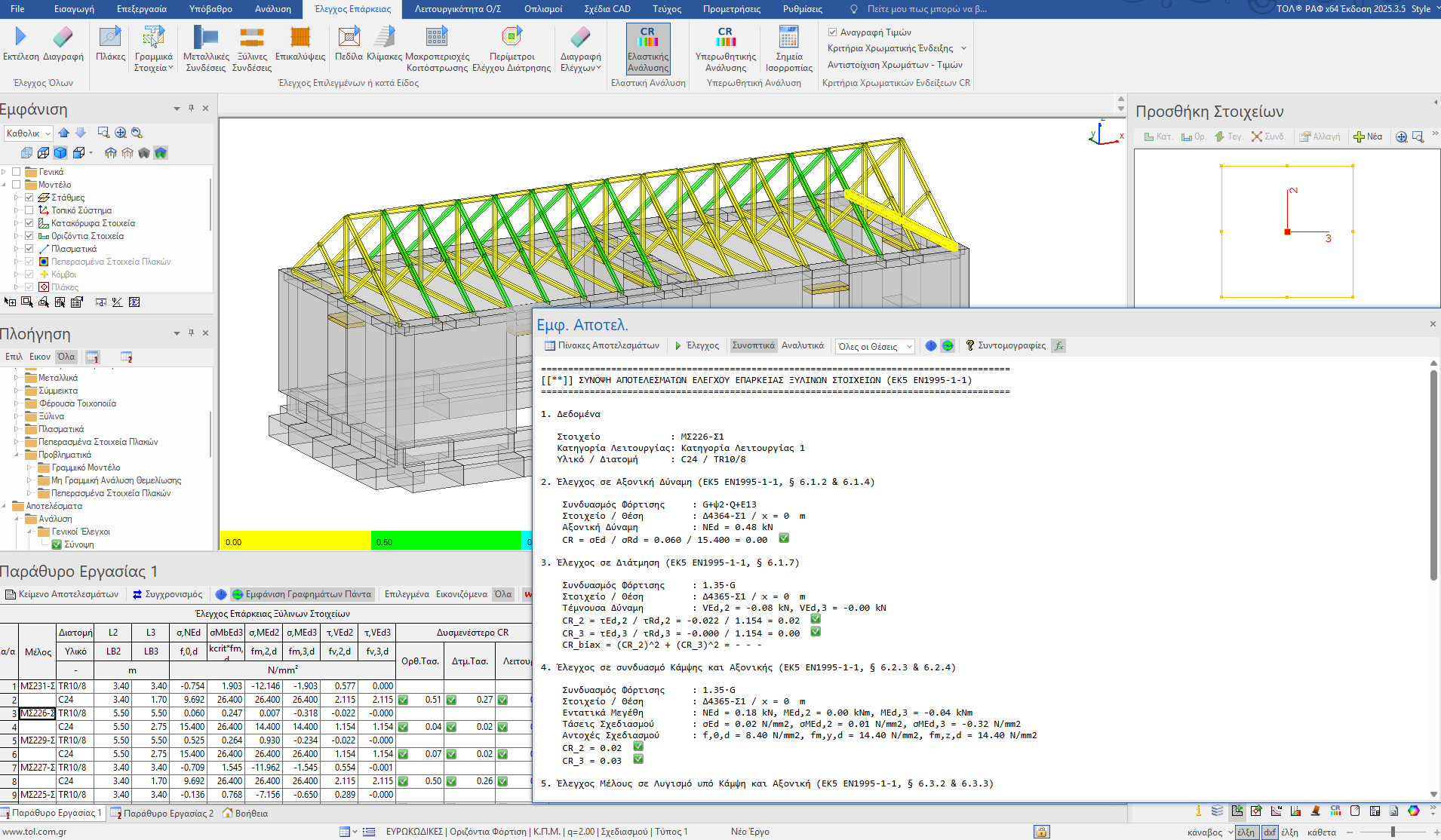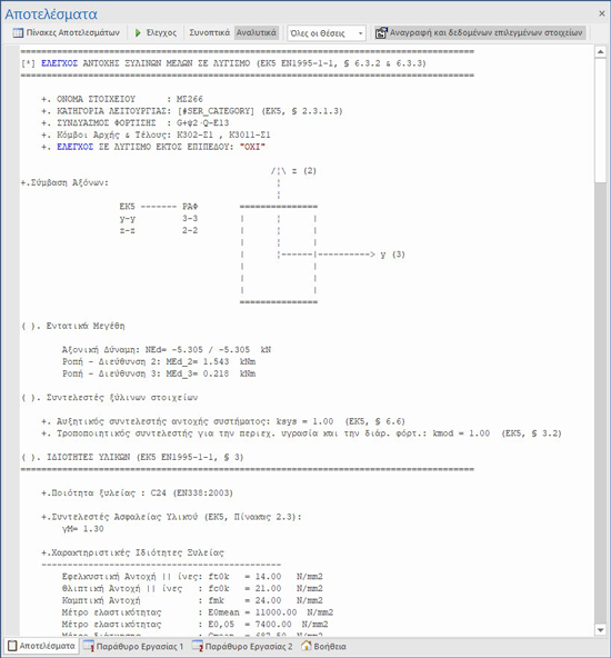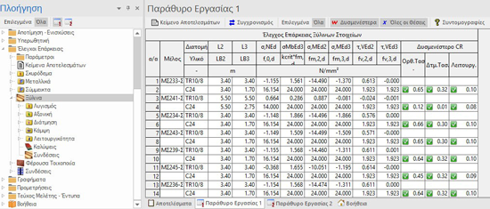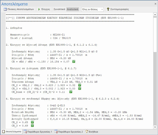 Με βάση την ανάλυση που έχει προηγηθεί, η υπομονάδα «Ξύλινες Κατασκευές» υπολογίζει τους συντελεστές εξάντλησης (CR) για όλους τους απαιτούμενους ελέγχους που προβλέπει ο Ευρωκώδικας 5, για κάθε είδους στοιχείο και μακροστοιχείο, για τις συνδέσεις καθώς και για τις επικαλύψεις. Οι έλεγχοι περιλαμβάνουν τους ελέγχους σε εφελκυσμό, θλίψη, κάμψη, διάτμηση, καμπτικό και στρεπτοκαμπτικό λυγισμό για κάθε συνδυασμό φόρτισης κατά την οριακή κατάσταση αστοχίας, αλλά και τους ελέγχους λειτουργικότητας.
