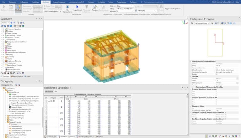 Η ανάλυση μίας ξύλινης τετράριχτης στέγης πάνω σε κτήριο φέρουσας τοιχοποιίας πραγματοποιείται ως ένας ενιαίος φορέας στο ΡΑΦ, λαμβάνοντας υπόψη την αλληλεπίδραση των διαφορετικών υλικών.