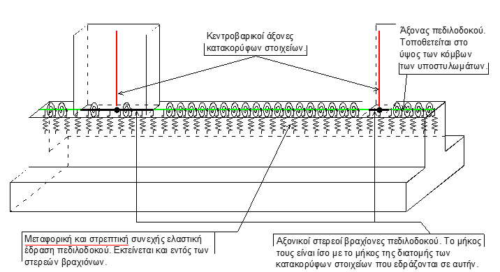 Οι πεδιλοδοκοί διαθέτουν συνεχή ελαστική έδραση, μεταφορική και στροφική, για τον ακριβέστερο υπολογισμό των εντατικών μεγεθών τους, των τάσεων εδάφους αλλά και για τα εντασιακά μεγέθη της ανωδομής. Οι στερεοί βραχίονες αρχής και τέλους, λαμβάνονται υπόψη και στις ελαστικά εδραζόμενες πεδιλοδοκούς.