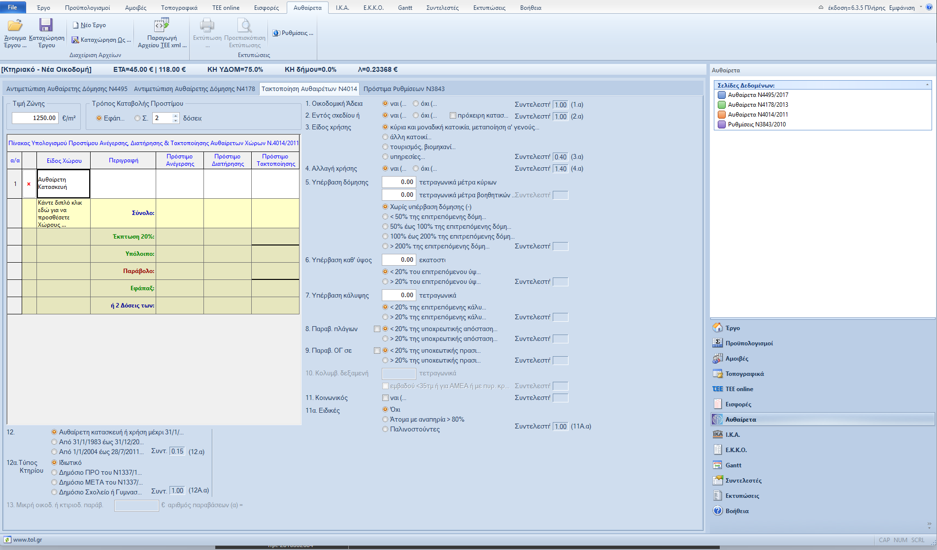 Παρουσιάζονται τα δεδομένα του προγράμματος και οι υπολογισμοί τους προστίμου ρύθμισης ή τακτοποίησης αυθαιρέτων. Υποστηρίζονται όλοι οι νόμοι: Ν3843/2010, Ν4014/2011, Ν4178/2013 και Ν4495/2017.