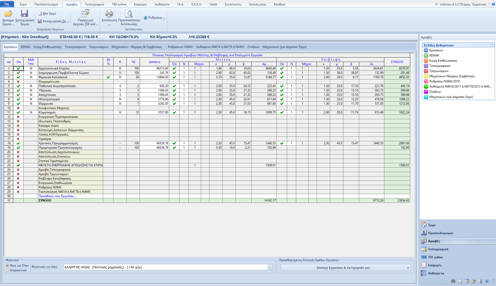 Ανάλυση αμοιβών ανά μηχανικό με δυνατότητα τροποποίησης της τελικής αμοιβής έτσι ώστε τα τελικά έντυπα (ΦΕΜ, ΤΣΜΕΔΕ κλπ) να συμφωνούν με τις αποδείξεις παροχής υπηρεσιών των μηχανικών (π.χ. σε περίπτωση έκδοσης Α.Π.Υ. με στρογγυλοποιημένα ποσά). Στη σελίδα αυτή το πρόγραμμα συνοψίζει τις νόμιμες και συμβατικές αμοιβές ανά μηχανικό για μελέτη, επίβλεψη και τοπογραφικό. Στον πίνακα παρουσιάζονται μόνο οι μηχανικοί που συμμετέχουν στο έργο.