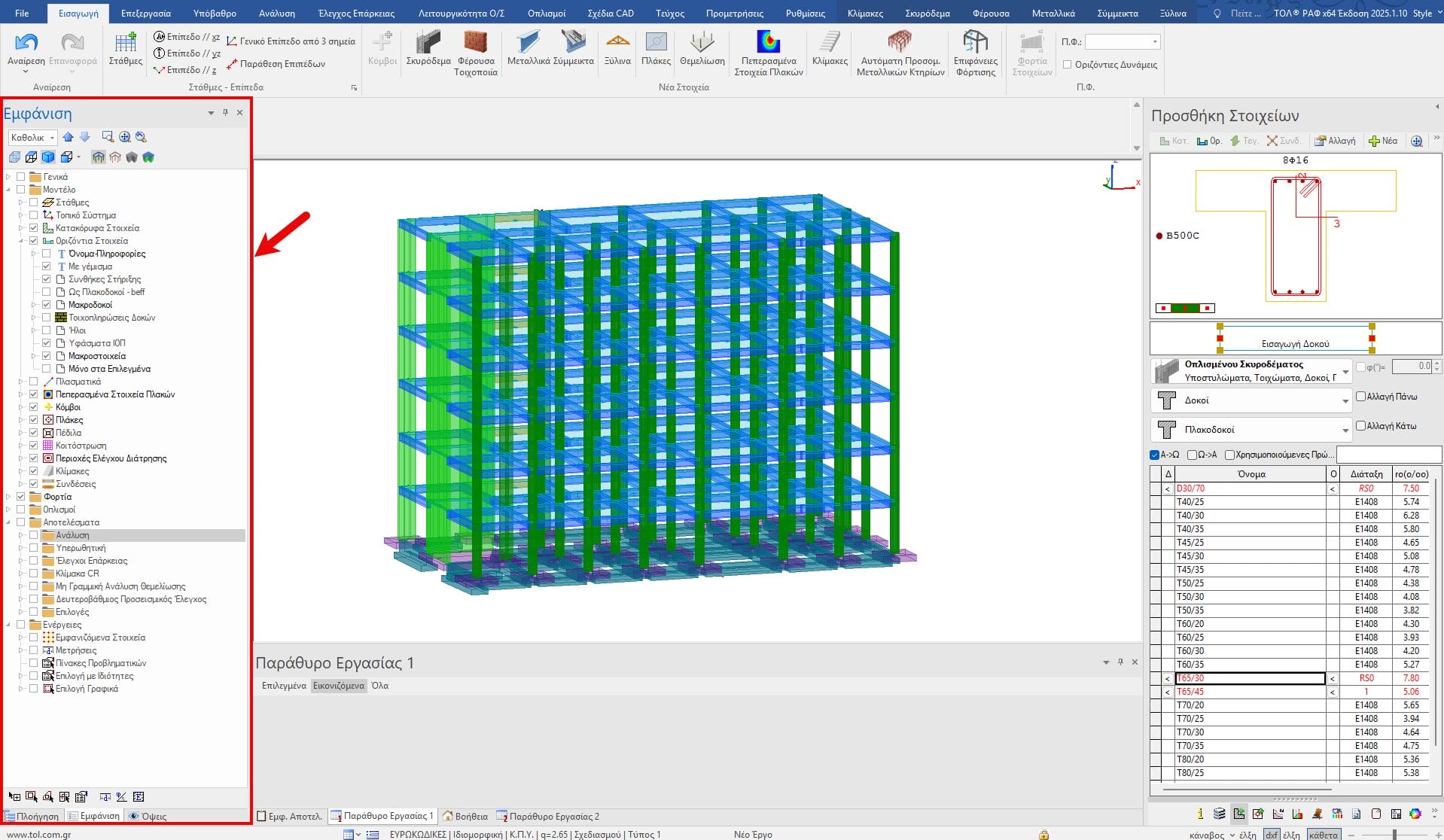 Ο μηχανικός έχει την δυνατότητα από τις επιλογές εμφάνισης να μεταβαίνει στις στάθμες του κτηρίου, να εμφανίζει το προσομοίωμα ως ραβδόμορφο μοντέλο ή συμπαγές και να επιλέγει αν θα εμφανίζονται τα δομικά στοιχεία και τα χαρακτηριστικά τους στην οθόνη.