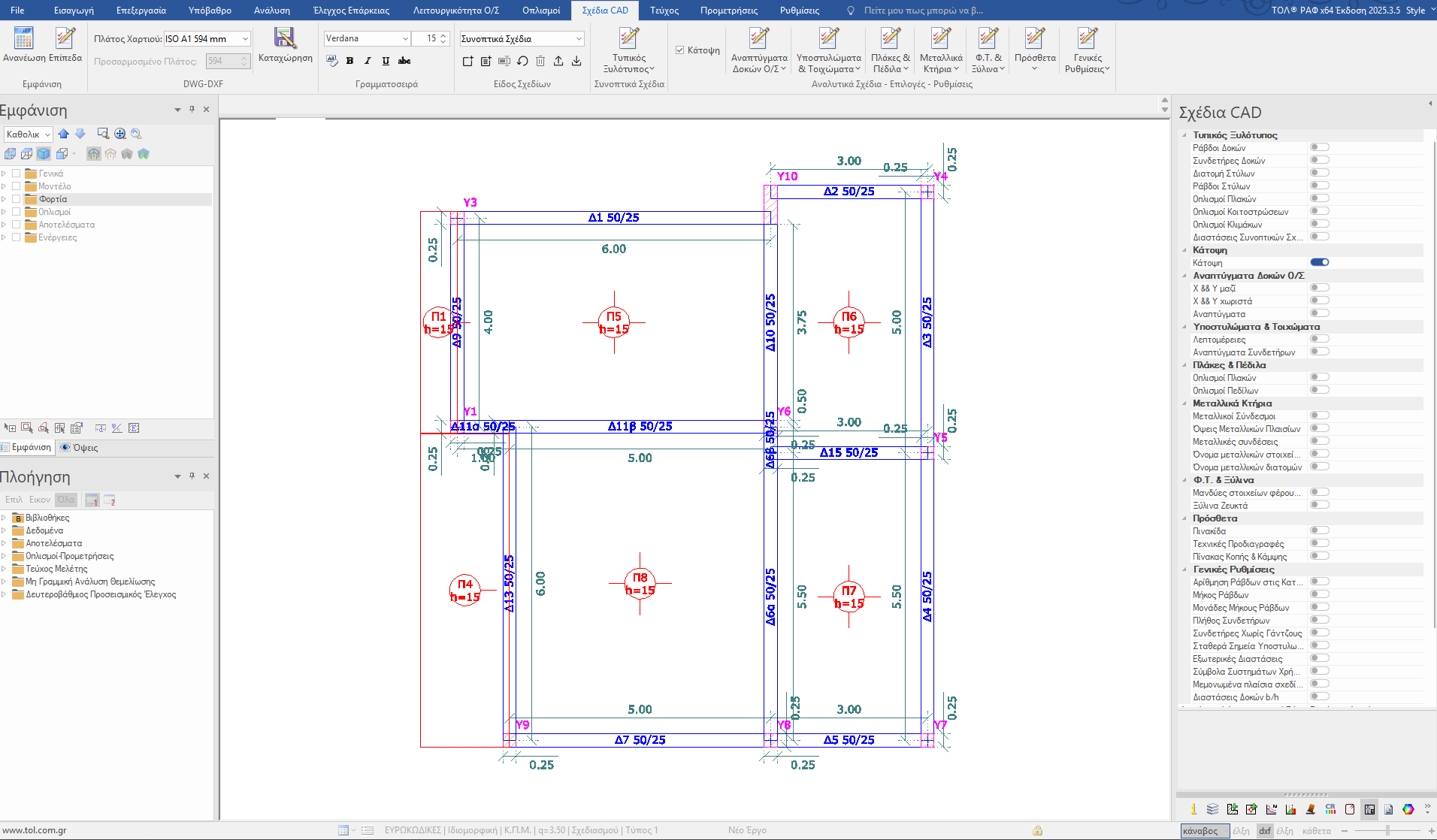Τα εξαγόμενα σχέδια αφορούν την κάτοψη του κτηρίου, των πεσσών και των υπέρθυρων μαζί με την αναγραφή του ονόματος της διατομής και των διαστάσεών τους.