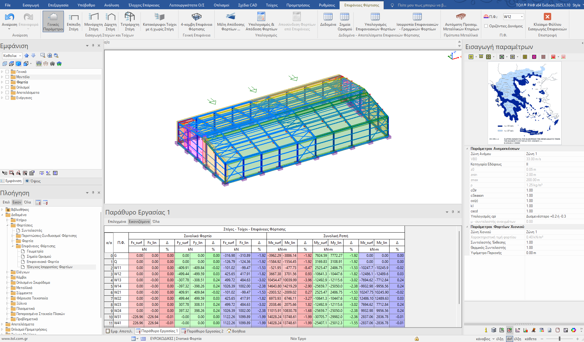 Η υπομονάδα ‘Δράσεις Ανέμων και Χιονιού’ του ΡΑΦ περιλαμβάνει τον υπολογισμό των δράσεων των ανέμων και των φορτίων χιονιού κατά το σχεδιασμό μεταλλικών αλλά και ξύλινων κτηρίων σύμφωνα με τις διατάξεις του ΕΚ-1.4. Δημιουργούνται με αυτοματοποιημένο και γρήγορο τρόπο οι επιφάνειες φόρτισης ενός κτηρίου που περιλαμβάνουν στέγες, επίπεδες, μονόριχτες, δίριχτες και τετράριχτες, κατακόρυφους τοίχους και πατάρια, με όλες τις απαιτούμενες περιπτώσεις και συνδυασμούς φόρτισης για την κατασκευή. Τα επιφανειακά αυτά φορτία θα μεταφερθούν αυτόματα στα γραμμικά μέλη ως γραμμικά φορτία.