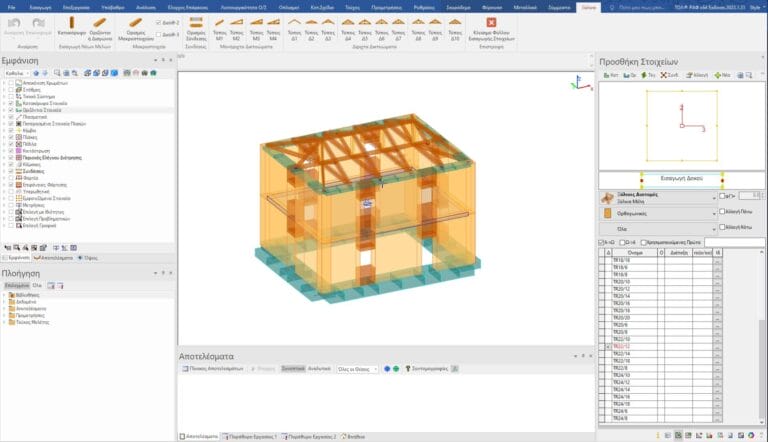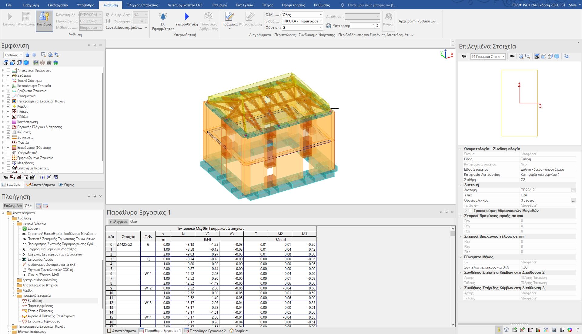 Η ανάλυση μίας ξύλινης τετράριχτης στέγης πάνω σε κτήριο ΦΤ πραγματοποιείται ως ένας ενιαίος φορέας στο ΡΑΦ, λαμβάνοντας υπόψη την αλληλεπίδραση των διαφορετικών υλικών και στη συνέχεια πραγματοποιώντας όλους τους απαραίτητους ελέγχους επάρκειας που ορίζουν οι κανονισμοί για τη δομική ξυλεία και τη φέρουσα τοιχοποιία.