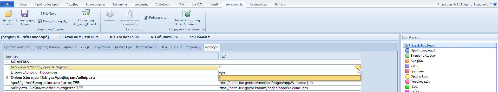 Με το Αμοιβές μπορούμε να συντάξουμε προϋπολογισμούς και αμοιβές τόσο σε ευρώ, όσο και σε δρχ. Η επιλογή του επιθυμητού νομίσματος γίνεται από τη σχετική λίστα επιλογών που βρίσκεται στο Φύλλο «Συντελεστές > Διάφοροι». Επίσης εδώ δηλώνουμε και το βήμα στρογγυλοποίησης των διαφόρων ποσών που επιθυμούμε. Το βήμα είναι το ίδιο και για τα δύο νομίσματα (μετατροπή του βήματος από το ένα νόμισμα στο άλλο). Το επιλεγμένο κάθε στιγμή νόμισμα, καταχωρείται στις τρέχουσες επιλογές του προγράμματος, οπότε θα είναι το νόμισμα με το οποίο θα ξεκινήσει η εφαρμογή και την επόμενη φορά.