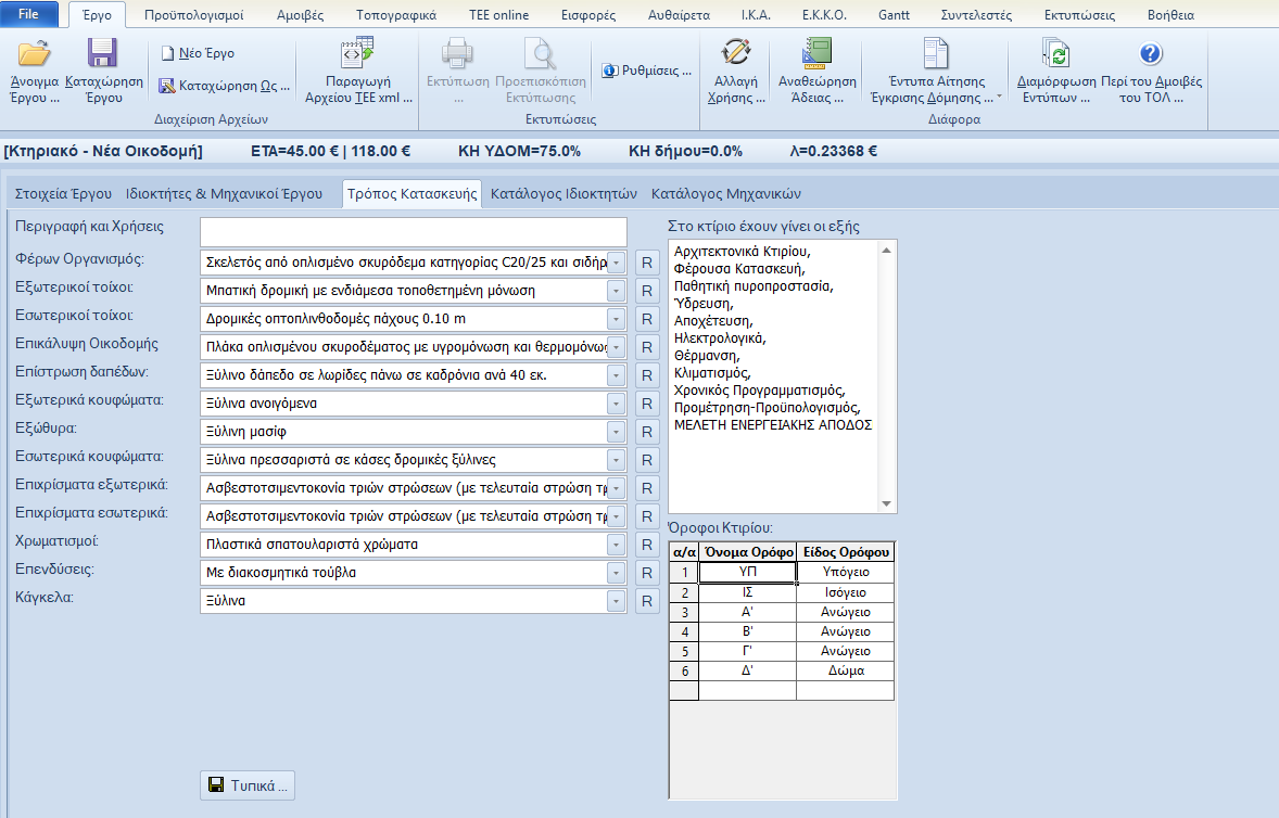 Στην σελίδα «Τρόπος Κατασκευής» του φύλλου «Έργο» μπορούμε να δώσουμε το πλήθος των ορόφων του κτιρίου, χαρακτηρίζοντας κάθε όροφο ως Υπόγειο, Ισόγειο, Ανώγειο ή Δώμα. Εφ’ όσον δοθούν οι όροφοι  μπορούμε πλέον να συντάξουμε με λεπτομέρεια τον εμβαδομετρικό προϋπολογισμό, του κτιρίου δίνοντας αναλυτικά τους χώρους από τις κατόψεις. Να σημειώσουμε εδώ ότι οι όροφοι δεν έχουν καμία σημασία στους υπολογισμούς.
