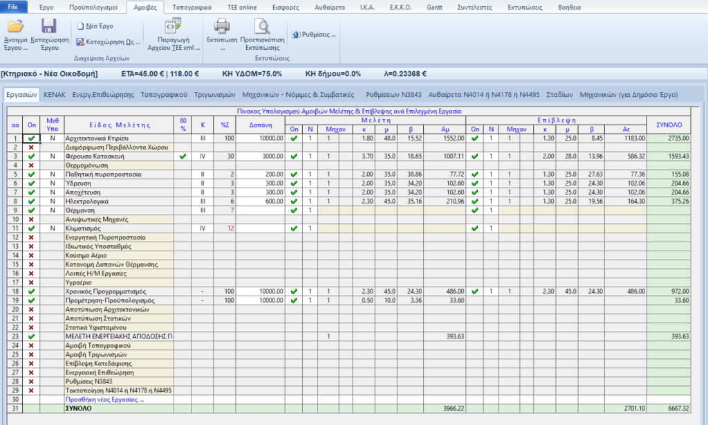 Αν θέλουμε να κατανείμουμε με διαφορετικά ποσοστά τον προϋπολογισμό στις εργασίες, ή αν έχουμε συντάξει αναλυτικά τον προϋπολογισμό για κάθε εργασία (π.χ. με τρέχων ΑΤΟΕ΄στο Excel), μπορούμε στο φύλλο «Αμοιβές» και στην σελίδα «Εργασιών» να εισάγουμε στην στήλη «Δαπάνη» το δαπάνη με την οποία θα υπολογιστεί η αμοιβή κάθε εργασίας χωρίστά. Στην περίπτωση αυτή το πρόγραμμα αναγράφει τη δαπάνη και το ποσοστό κατανομης με κόκκινο χρώμα. Με τον τρόπο αυτό μα προειδοποιεί ότι δεν αντιστοιχεί η δαπάνη στο συμβατικό ποσοστό.