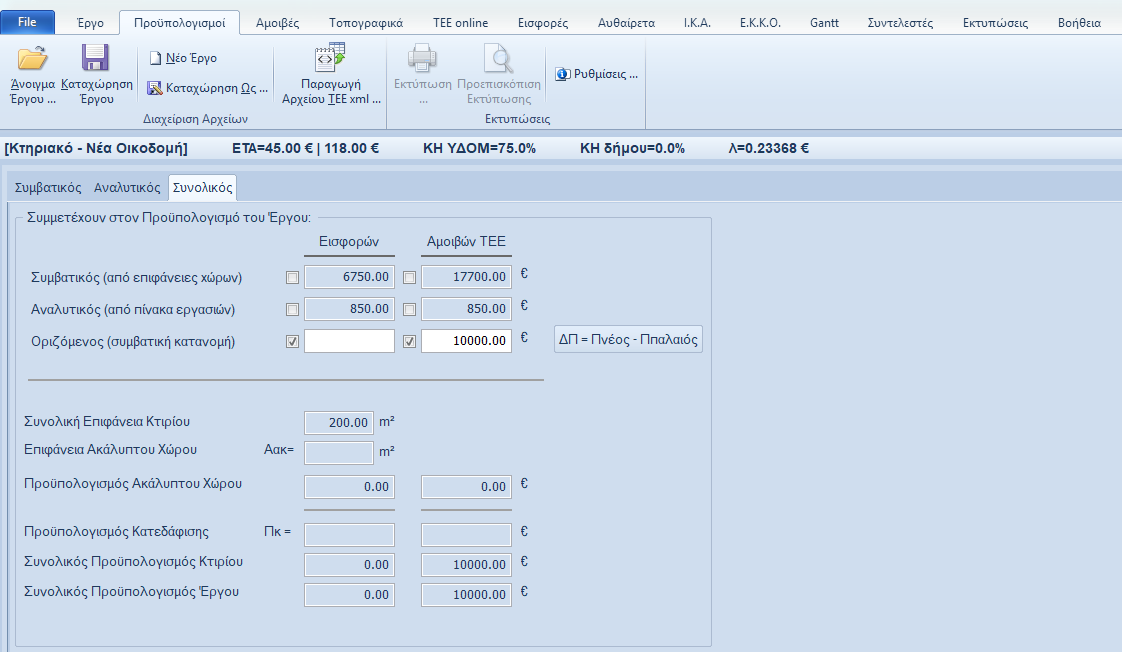 Στο φύλλο «Προϋπολογισμοί» και στην σελίδα «Συνολικός» μπορούμε να εισάγουμε στο πεδίο «Οριζόμενος (συμβατική κατανομή)» το ποσό του προϋπολογισμού που επιθυμούμε για τον υπολογισμό των εισφορών και των αμοιβών. Στην συνέχεια πατώντας το πλήκτρο «Εργασίες στις οποίες λαμβάνεται υπ’ όψιν ο Οριζόμενος Προϋπολογισμός» ενεργοποιούμε στον διάλογο που εμφανίζεται τις εργασίες οι οποίες επιθυμούμε να ληφθούν υπ’ όψιν στον προϋπολογισμό. Να σημειώσουμε εδώ ότι η κατανομή του ποσού θα γίνει σύμφωνα με την συμβατική κατανομή που επιβάλει ο νόμος.