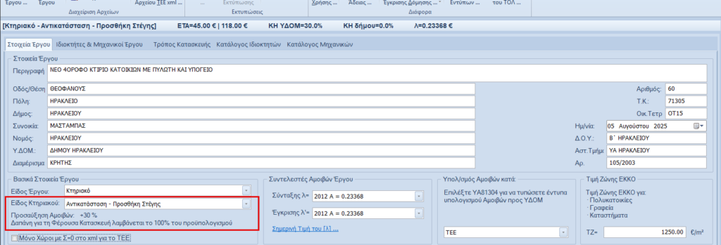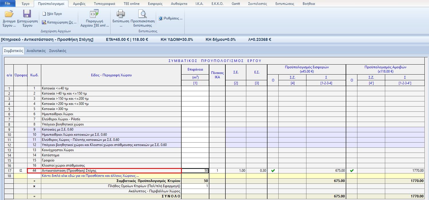 Οι χώροι κατηγορίας “44. Αντικατάσταση Στέγης” συμμετέχουν αυτόματα με το 100% του προϋπολογισμού τους στη δαπάνη για τη μελέτη φέρουσας κατασκευής και δεν χρειάζεται ο χρήστης να κάνει κάτι ιδιαίτερο. Στην περίπτωση αυτή το έργο θεωρείται προσθήκη και οι αμοιβές προσαυξάνονται 30%. Όταν έχουμε αντικατάσταση ή προσθήκη στέγης, θα πρέπει να δηλωθεί εδώ το είδος του έργου, ενώ θα πρέπει και στο συμβατικό να δοθούν τα τετραγωνικά στην κατηγορία 44.