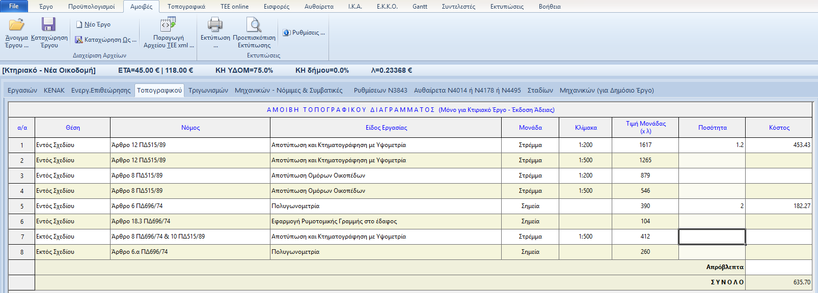 Στο σύστημα του ΤΕΕ και προκειμένου για έκδοση οικοδομικών αδειών, μπορούν να δοθούν με το αρχείο xml μόνο όσες τιμές αναγράφονται με μαύρο χρώμα στον πίνακα της σελίδας «Τοπογραφικού» του φύλλου «Αμοιβές». Οι γκρίζες γραμμές δεν υπάρχει τρόπος να δοθούν στο ΤΕΕ, αλλά δίνονται στο πρόγραμμα βοηθητικά ως συχνά ζητούμενες τοπογραφικές εργασίες, η αμοιβή των οποίων πολλές φορές ζητείται από τους μηχανικούς. Επομένως αν έχουμε συμπεριλάβει στον υπολογισμό της αμοιβής τοπογραφικού εργασίες οι οποίες ανήκουν στις γκρίζες γραμμές θα έχουμε σίγουρα διαφορά σε σχέση με την αμοιβή που υπολογίζει το ΤΕΕ.