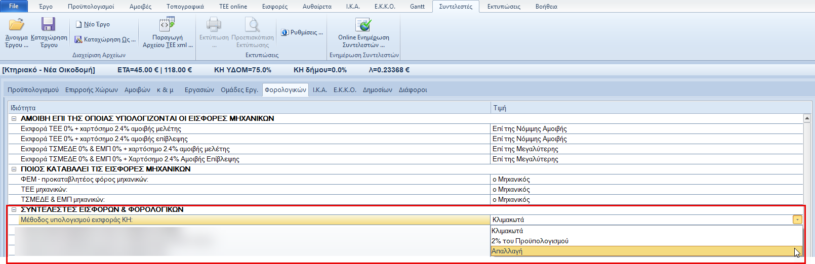 Αν έχουμε απαλλαγή από την εισφορά του ΚΗ ψηφίσματος θα πρέπει να το δηλώσουμε στο πρόγραμμα στο φύλλο “Συντελεστές | Φορολογικών”