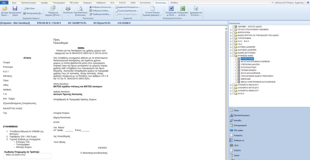 Στο φύλλο «Εκτυπώσεις» μπορούμε να βρούμε στον φάκελο «Ρυθμίσεις Ν. 3843 όλα τα απαιτούμενα έντυπα, τα περισσότερα από τα οποία συμπληρώνονται αυτόματα από το πρόγραμμα με βάσει τα στοιχεία που έχουμε καταχωρήσει. Τα ειδικά έντυπα αυτά έχουμε την δυνατότητα να τα τροποποιήσουμε ή/και να τα συμπληρώσουμε στο Word ή στο Excel επιλέγοντας τα σχετικά πλήκτρα στο πεδίο «Επεξεργασία Εντύπων» της ταινίας εντολών.