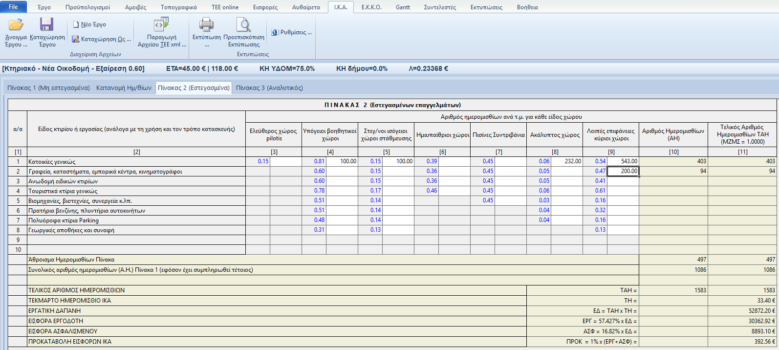 Στην περίπτωση αυτή τα ημερομίσθια αφορούν εστεγασμένα επαγγέλματα κι επομένως ο πίνακας που συμπληρώνεται είναι ο Πίνακας 2 που βρίσκεται στο φύλλο «ΙΚΑ» σελίδα «Πίνακας 2 (Εστεγασμένα). Αν έχουμε συντάξει εμβαδομετρικό προϋπολογισμό ο Πίνακας 2 συμπληρώνεται αυτόματα από το πρόγραμμα διαφορετικά εισάγουμε, ανάλογα με το είδος του κτιρίου ή της εργασίας και του είδους κάθε χώρου, τα τετραγωνικά που επιθυμούμε στα κελιά λευκού χρώματος που αντιστοιχούν στον συνδυασμό κτιρίου/εργασίας και χώρου για το έργο. Αυτόματα το πρόγραμμα υπολογίζει τον αριθμό των ημερομισθίων στην τελευταία στήλη του πίνακα.