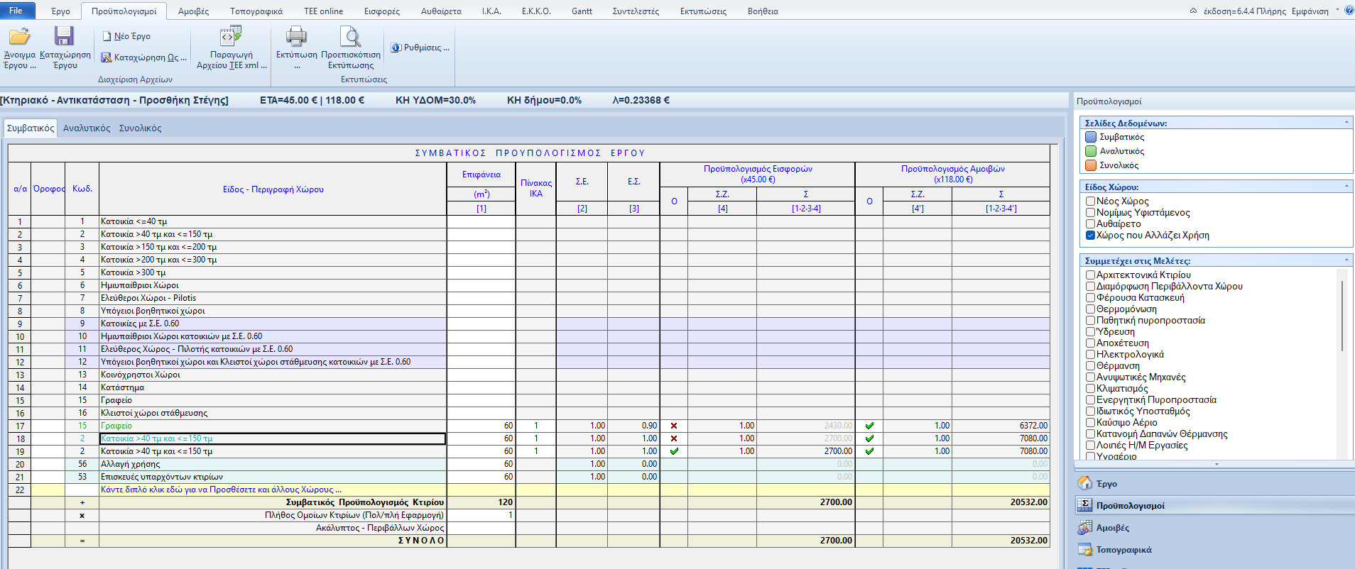 Αν γίνεται προσθήκη ή/και διαρρύθμιση στην αλλαγή χρήσης τότε αφενός για την προσθήκη προστίθενται στον Πίνακα 1 ή στον Πίνακα 2 τα ημερομίσθια που προκύπτουν από τα τετραγωνικά της προσθήκης, κι αφετέρου για την διαρρύθμιση συμπληρώνεται ο Αναλυτικός Προϋπολογισμός – Πίνακας 3 ΙΚΑ. Στη περίπτωση αυτή το σύνολο των ημερομισθίων προκύπτει από το άθροισμα των ημερομισθίων της αλλαγής χρήσης, της προσθήκης και της διαρρύθμισης.Σε κάθε περίπτωση κάνοντας χρήση του wizard για την αλλαγή χρήσης της έκδοσης 4 του προγράμματος των Αμοιβών Μηχανικών τα ημερομίσθια της αλλαγής χρήσης και της προσθήκης υπολογίζονται αυτόματα. Στην περίπτωση που υπάρχει και διαρρύθμιση τότε το μόνο που έχουμε να κάνουμε αφού τελειώσουμε την διαδικασία του wizard είναι να συμπληρώσουμε τον Αναλυτικό Προϋπολογισμό – Πίνακα 3 ΙΚΑ.