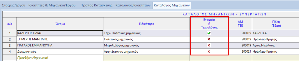 Θα πρέπει να ‘τσεκαριστεί’ το πεδίο στην σχετική στήλη του πίνακα που εμφανίζεται στην σελίδα «Κατάλογος Μηχανικών» του φύλλου «Έργο».