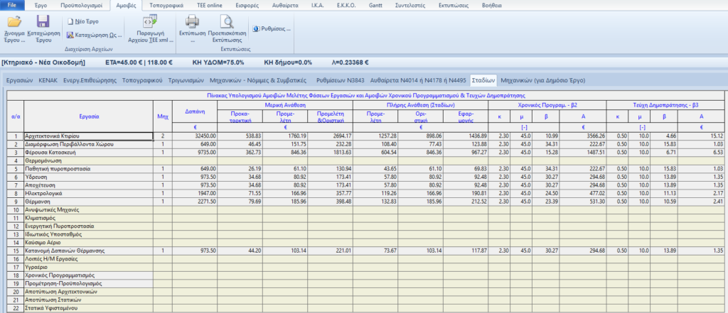 Στην σελίδα «Σταδίων» του φύλλου «Αμοιβές» εμφανίζεται ο Πίνακας Υπολογισμού Αμοιβών Μελέτης Φάσεων Εργασιών και Αμοιβών Χρονικού Προγραμματισμού & Τευχών […]