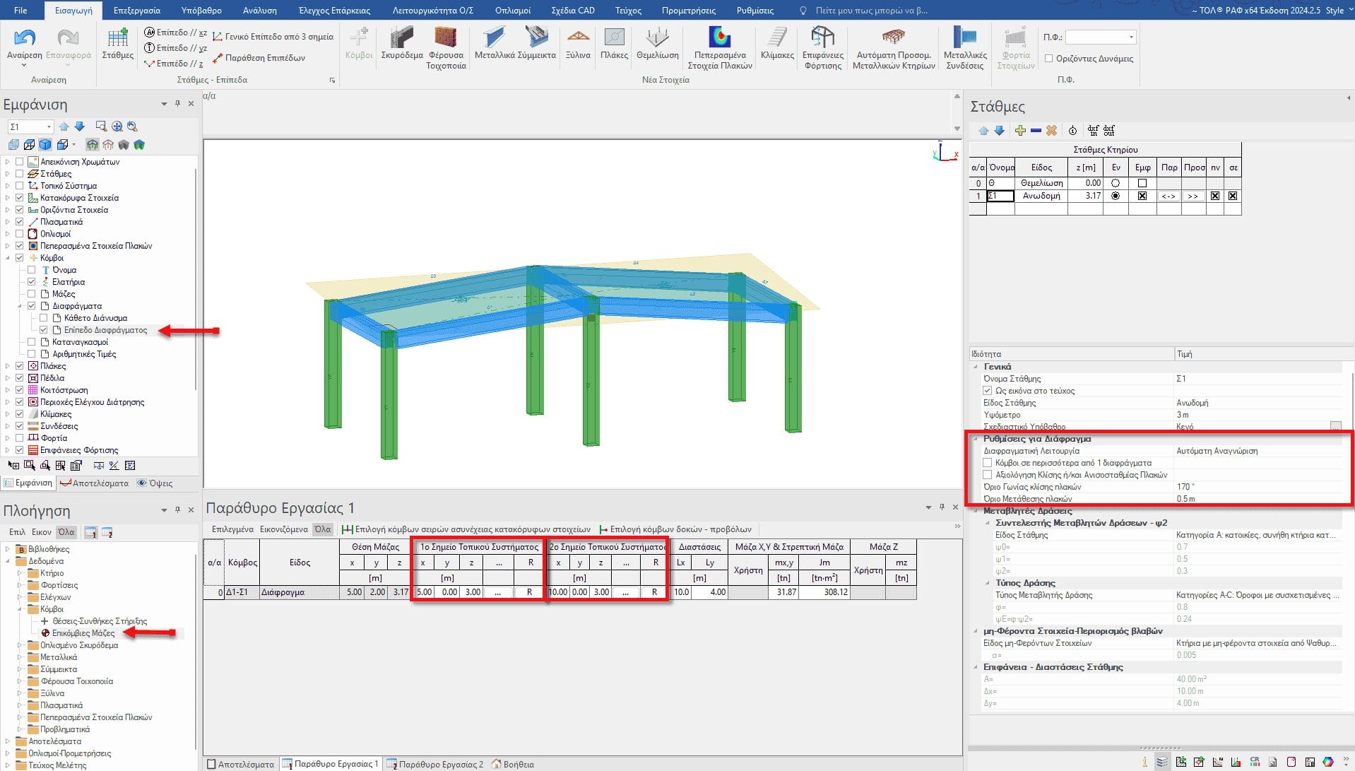 Στην έκδοση 2023.5.x.x του ΡΑΦ έγινε σειρά σημαντικών βελτιώσεων στην αξιολόγηση της διαφραγματικής λειτουργίας των πλακών. Τροποποιήθηκε ο αλγόριθμος υπολογισμού ενώ προστέθηκαν και νέες δυνατότητες και εργαλεία, τα οποία επιτρέπουν στο μηχανικό τη διαφοροποίηση του απαραμόρφωτου επιπέδου στο οποίο λειτουργεί κάθε διάφραγμα. Οι νέες δυνατότητες επιτρέπουν την ακριβέστερη προσομοίωση της διαφραγματικής λειτουργίας σε σύνθετα έργα, ιδιαίτερα με κεκλιμένες ή/και ανισόσταθμες πλάκες στον ίδιο όροφο του κτηρίου. Χωρίς να επηρεαστεί η λειτουργία της μέσω των πλακών αυτόματης αναγνώρισης των κόμβων που συμμετέχουν σε κάθε διάφραγμα, ο μηχανικός, αν το κρίνει σκόπιμο, έχει πλέον τη δυνατότητα να επέμβει και να διαφοροποιήσει κατά την κρίση του τη διαφραγματική λειτουργία των πλακών.