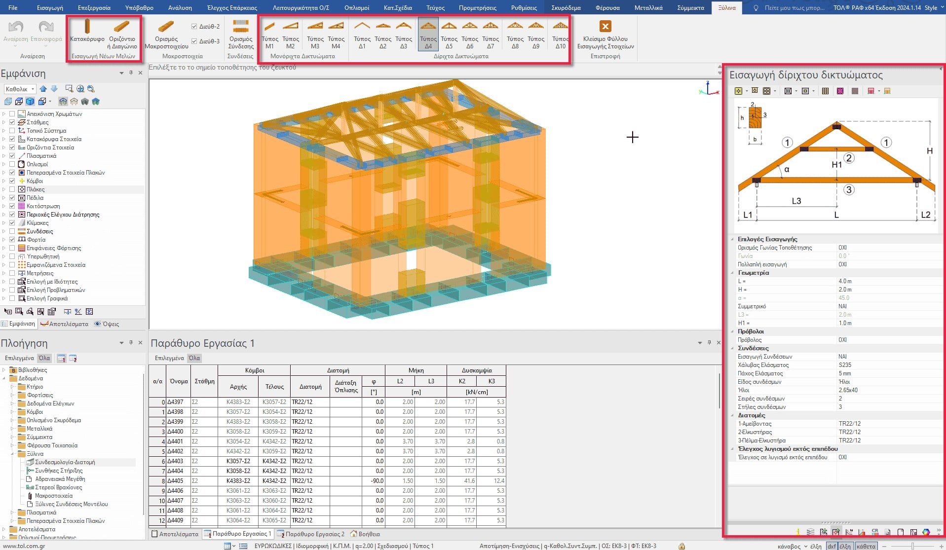Μεταβαίνουμε από το φύλο εισαγωγή στην Ενότητα «Ξύλινα». Στην ταινία εντολών εμπεριέχονται τα συνηθέστερα μονόριχτα και δίρριχτα δικτυώματα που χρησιμοποιούνται στην πράξη. Εάν ο μελετητικής μηχανικός επιθυμεί να δημιουργήσει μια διαφορετική σύνθεση, το ΡΑΦ παρέχει τη δυνατότητα δημιουργίας οποιασδήποτε διάταξης, μέσω της εισαγωγής νέων μεμονωμένων μελών. Για την προσομοίωση της τετράριχτης στέγης, χρησιμοποιούμε συνδυαστικά κάποια από τα δικτυώματα που προσφέρει το ΡΑΦ. Πιο συγκεκριμένα χρειαζόμαστε το δικτύωμα τύπου 6, το δίρριχτο δικτύωμα Δ1 και μεμονωμένα οριζόντια μέλη επιθυμητής διατομής.