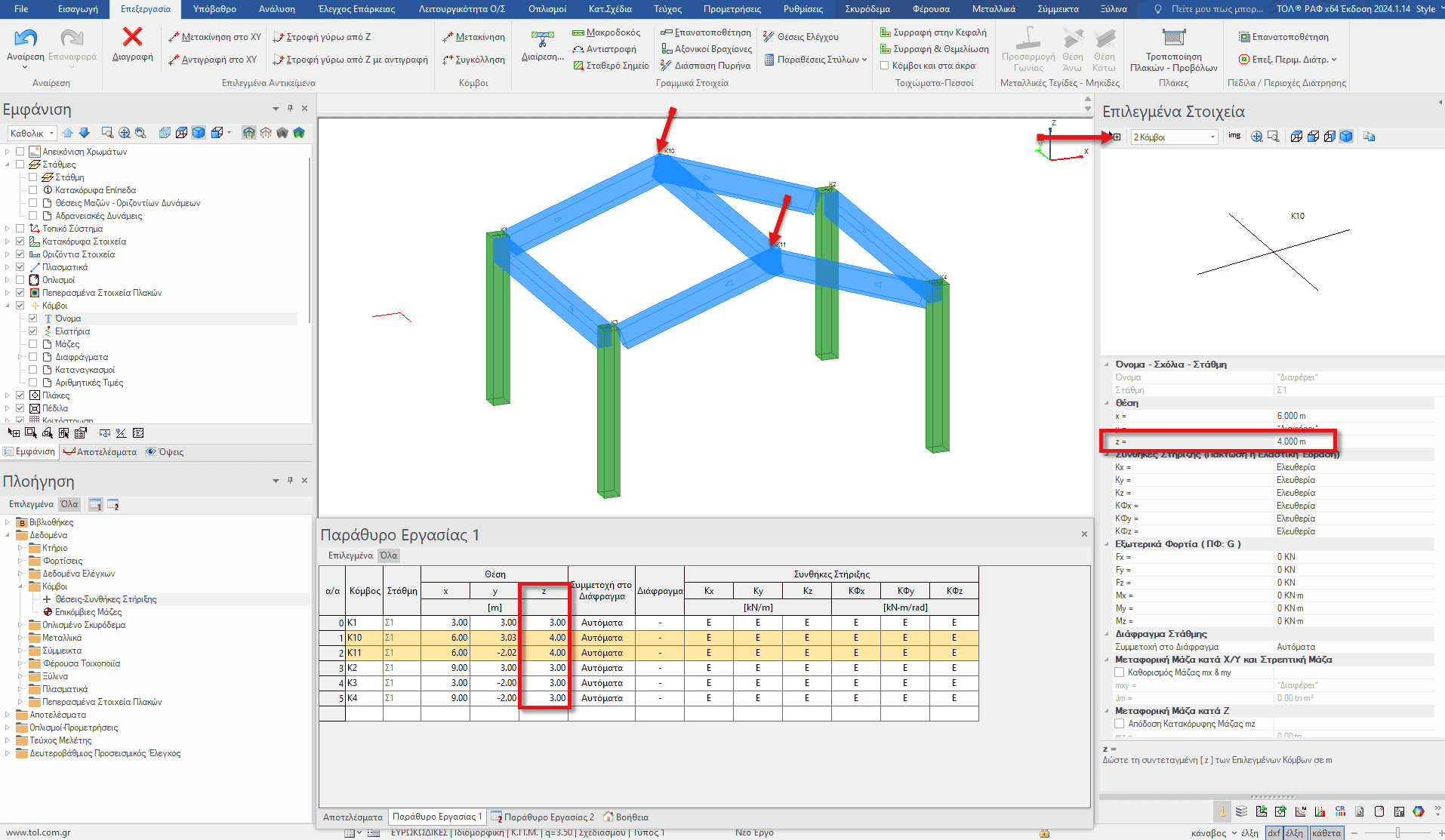 Αν το ζητούμενο μας είναι να δημιουργήσουμε μια κεκλιμένη στέγη τότε επιλέγουμε τους κόμβους των στοιχείων που επιθυμούμε να ανυψώσουμε και στην δεξιά πινακίδα δεδομένων τροποποιούμε την συντεταγμένη z. Με τον τρόπο αυτό οι δοκοί που είναι συνδεδεμένοι με τους συγκεκριμένους κόμβους αυτόματα προσαρμόζονται στην αλλαγή κλίσης.