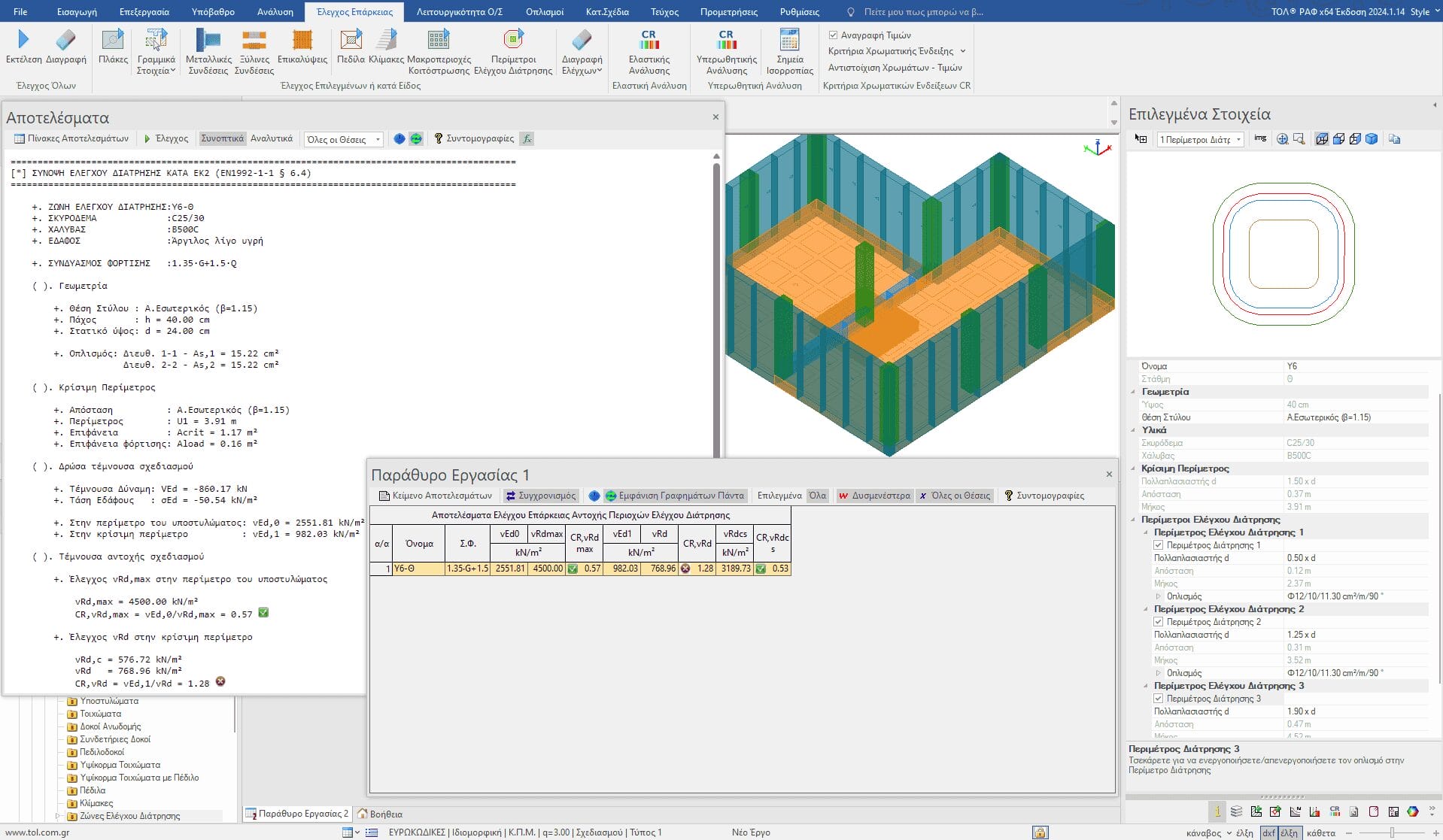 Στο ΡΑΦ δίνεται η δυνατότητα εισαγωγής περιοχών ελέγχου διάτρησης στην κοιτόστρωση. Σκοπός των περιοχών αυτών είναι ο έλεγχος και η αντιμετώπιση του φαινομένου της διάτρησης που εμφανίζεται στα σημεία έδρασης των κατακόρυφων στοιχείων στην κοιτόστρωση. Οι περιοχές ελέγχου διάτρησης αποτελούνται από πιθανό πρόσθετο κάτω οπλισμό κάμψης, την περίμετρο ελέγχου διάτρησης γύρω από το κατακόρυφο στοιχείο καθώς και από πιθανές περιμέτρους πρόσθετου οπλισμού διάτρησης. Μετά την ανάλυση, επιλέγουμε το υποστύλωμα στο οποίο επιθυμούμε να εκτελέσουμε έλεγχο διάτρησης. Μεταφερόμαστε στο φύλλο «Εισαγωγή» και Θεμελίωση κι ενεργοποιούμε το πλήκτρο «Απλή σε ένα στοιχείο» για να εισάγουμε μεμονωμένη περιοχή ελέγχου διάτρησης στο υποστύλωμα. Κάθε περιοχή ενίσχυσης που τοποθετείται στην κοιτόστρωση περιλαμβάνει εκτός από την κρίσιμη ζώνη ελέγχου διάτρησης, άλλες 3 ζώνες ελέγχου. Τις ζώνες αυτές μπορούμε να τις δούμε γραφικά ενεργοποιώντας την επιλογή «Περίμετροι Τοποθέτησης Οπλισμού» από το δέντρο Εμφάνισης. Με δεξί κλικ πάνω στη βασική περίμετρο ελέγχου και την εντολή «Έλεγχος αντοχής επιλεγμένων» πραγματοποιείται ο έλεγχος διάτρησης και εμφανίζονται άμεσα τα αποτελέσματά του με χρωματική ένδειξη και σε πίνακα.