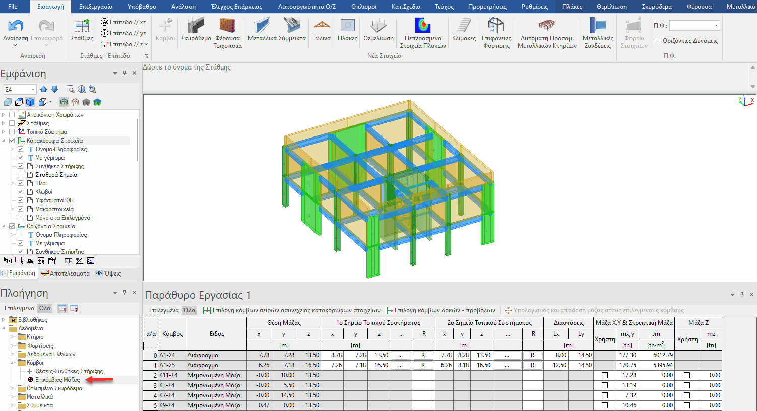 Στο ΡΑΦ, αναγνωρίζεται αυτόματα ο αριθμός των δημιουργούμενων διαφραγμάτων σύμφωνα με τη διάταξη των πλακών στην κάτοψη. Η θέση των διαφραγμάτων και το μέγεθος της μεταφορικής και της στρεπτικής μάζας εμφανίζονται επίσης σε πινακοποιημένη μορφή, ακολουθώντας τη διαδρομή «Δεδομένα» -> «Κόμβοι»-> «Επικόμβιες Μάζες» του δέντρου της πλοήγησης. Ο μηχανικός εφόσον το επιθυμεί μπορεί να τροποποιήσει τις τιμές των μαζών των διαφραγμάτων σύμφωνα με την κρίση του.