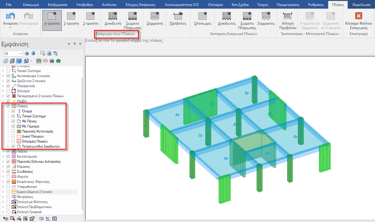 Η εισαγωγή των πλακών πραγματοποιείται από το Φύλλο «Εισαγωγή» της ταινίας εντολών και την Ενότητα «Πλάκες» και έχουμε δύο εναλλακτικούς τρόπους που μπορούμε να τις εισάγουμε, χειροκίνητα ή αυτόματα. Με την χειροκίνητη εισαγωγή, επιλέγουμε το πεδίο με το είδος της πλάκας που επιθυμούμε να εισάγουμε και επιλέγουμε διαδοχικά τους κατάλληλους κόμβους που θα ορίζουν το περίγραμμά της. Εναλλακτικά, μπορούμε να επιλέξουμε, το πλήκτρο «Ολόσωμες» ώστε οι πλάκες να εισαχθούν μαζικά, με αυτόματο τρόπο, εύκολα και γρήγορα.