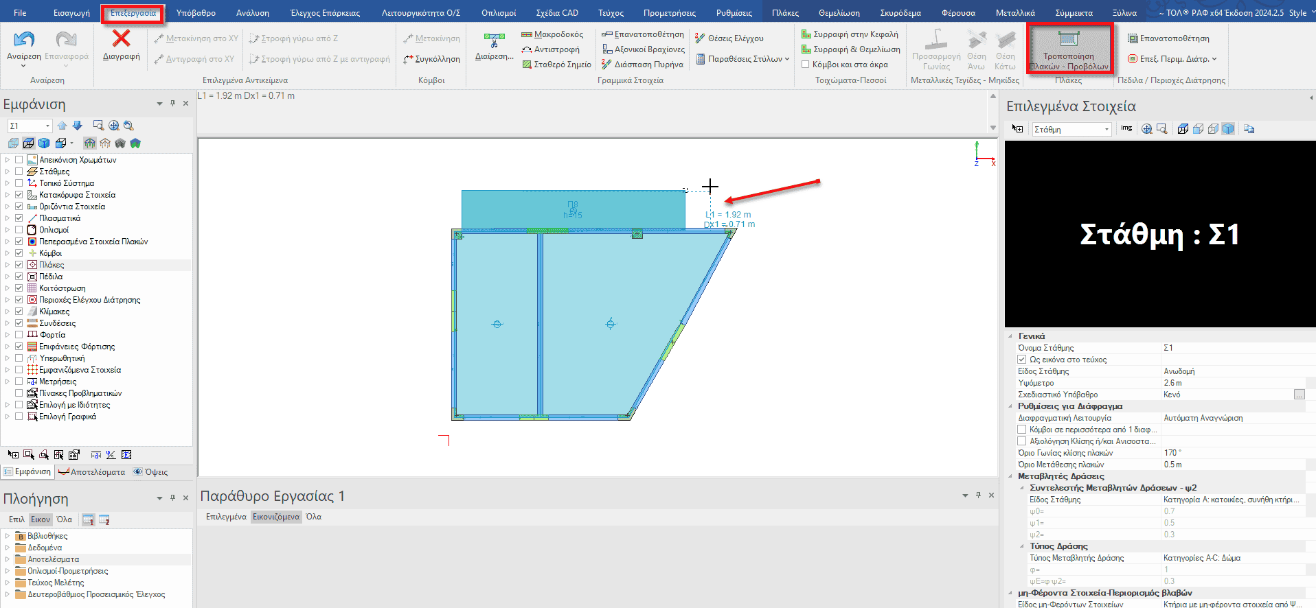 Η ενότητα εισαγωγής πλακών προβόλων εμφανίζεται στην πινακίδα δεδομένων κι ενεργοποιείται είτε από το φύλλο «Εισαγωγή», ενότητα «Πλάκες», πλήκτρο «Πρόβολος», είτε από τα πλήκτρα εμφάνισης δεδομένων πατώντας το πλήκτρο της «Προσθήκης Πλακών» και στη συνέχεια το πλήκτρο «Εισαγωγή Προβόλου» από την εργαλειοθήκη της πινακίδας δεδομένων. Για να εισάγουμε μια πλάκα-πρόβολο απαιτείται να υπάρχουν δύο κόμβοι, οι οποίοι να συνδέονται μεταξύ τους με ένα ή περισσότερα οριζόντια γραμμικά στοιχεία. Η εισαγωγή του προβόλου γίνεται πατώντας το πλήκτρο «Πρόβολος» από το φύλλο εισαγωγής και στη συνέχεια επιλέγοντας διαδοχικά τον πρώτο και τον τελευταίο κόμβο της πλευράς στήριξης του προβόλου.
