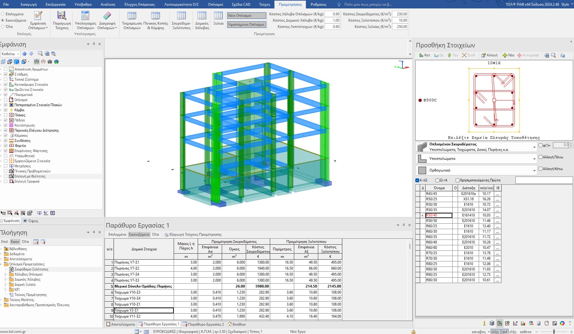 Από το φύλλο «Προμετρήσεις», ορίζουμε το κόστος του χάλυβα οπλισμού, του σκυροδέματος και του ξυλοτύπου ανά κιλό. Τα αποτελέσματα των υπολογισμών της προμέτρησης μπορούμε να τα δούμε ομαδοποιημένα ανά είδος στοιχείου για κάθε στάθμη, αλλά και για όλο το κτήριο. Από το πεδίο «Χάλυβας Οπλισμού» και «Υπολογισμός Οπλισμού», μπορούμε να δούμε την προμέτρηση όλων των χρησιμοποιούμενων ράβδων του έργου, επιλέγοντας το πλήκτρο «Όλα» και το πλήκτρο «Βάρος-Κόστος».